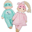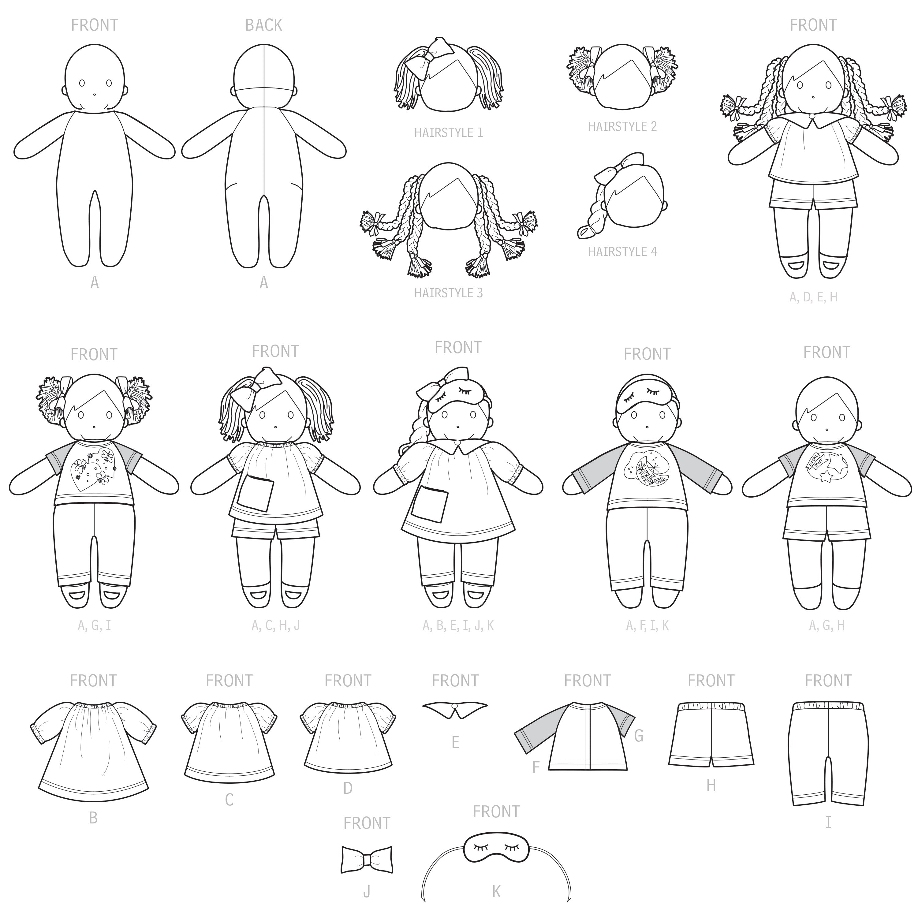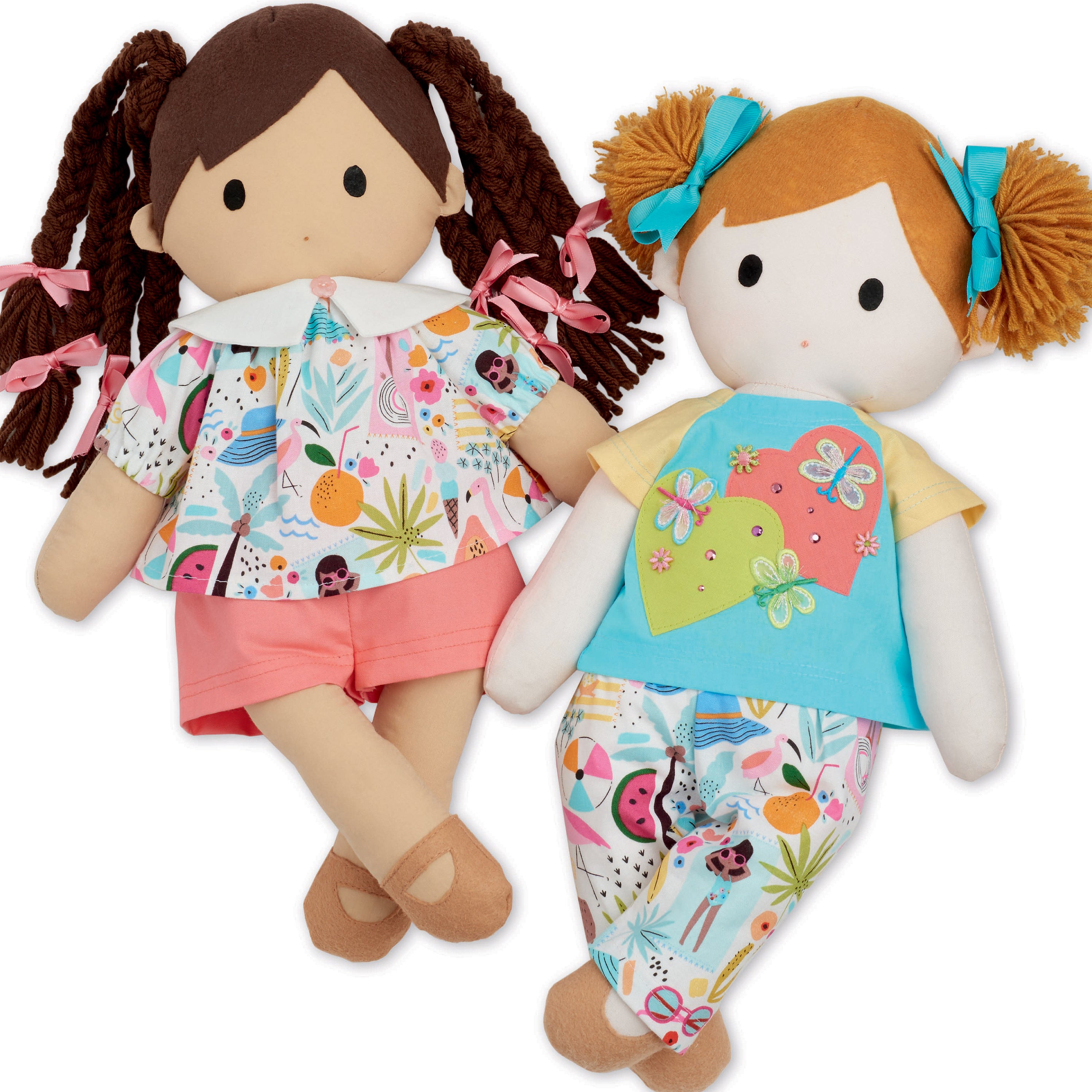 19" plush dolls are easy to sew and customized with felt and yarn hair styles, felt appliqued shoes and a mix and match wardrobe. Clothes include pullover dress and top with detachable collar, raglan sleeve tops with hook and loop tape back closure, pull-on pants and shorts with elastic waists, tailored bow and sleep mask accessory with ribbon ties.