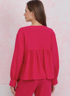 Lounge around with this cozy set! Loose fitting top with deep V-neck opening has length and sleeve variations. Long sleeves with wide cuffs or short sleeves with ruffles. Relaxed fit pants and shorts have elastic waistband and front ties.