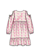 Relaxed fit tiered dress for children and girls sized 3 to 14 has lace trim, invisible zipper closure and sleeve variations. Views A and B have shoulder cutout with bow detail. View C dress has long puffed and gathered sleeves. View D is a sleeveless dress.
