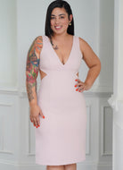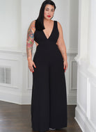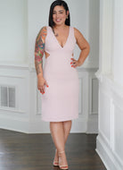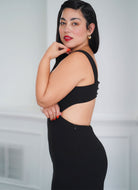 Sleeveless dress and jumpsuit have deep V-neck, lined bodice with cut out midriff detail, side invisible zipper, and buttons with elastic loops at back bodice.