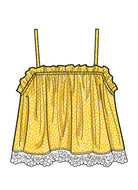 Tops have ruffles and elastic at neckline. View A has wide straps with ruffle sleeves. Views A and B have bows at front. Views B and C have adjustable spaghetti straps. View C has purchased lace trim at hem.