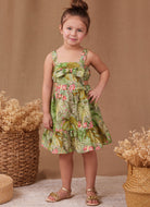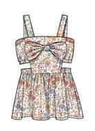 Adorable dress and top feature bow detail on the front and an open back design. Dress and top have ruffles at the hem and elastic at bodice and skirt. Pull-on shorts have slits at the side seams and front patch pockets.