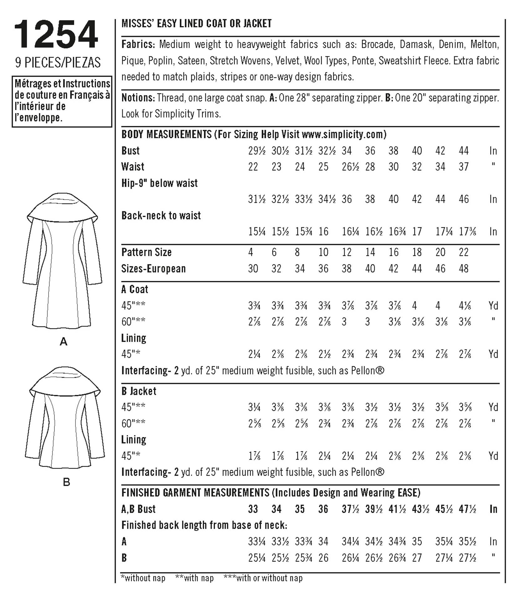 Simplicity Sewing Pattern 1254 - Women's Leanne Marshall Easy Lined Coat or Jacket
