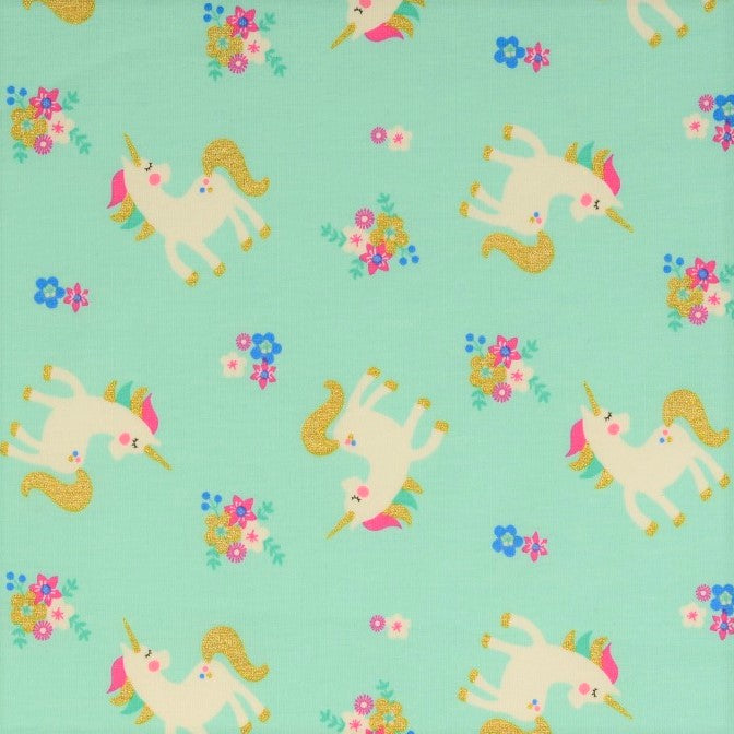 Indulge yourself in some of this soft, fun printed jersey, perfect for making clothes! With 4-way stretch and a high percentage of cotton, it's super comfortable against the skin and easy to wear. What makes this design extra special, is the glittering gold metallic finish on the horns, tails and hooves of the unicorns, decorated with the prettiest blooms dotted around here and there too! Make cute dresses, leggings, tops and skirts with this pretty print.