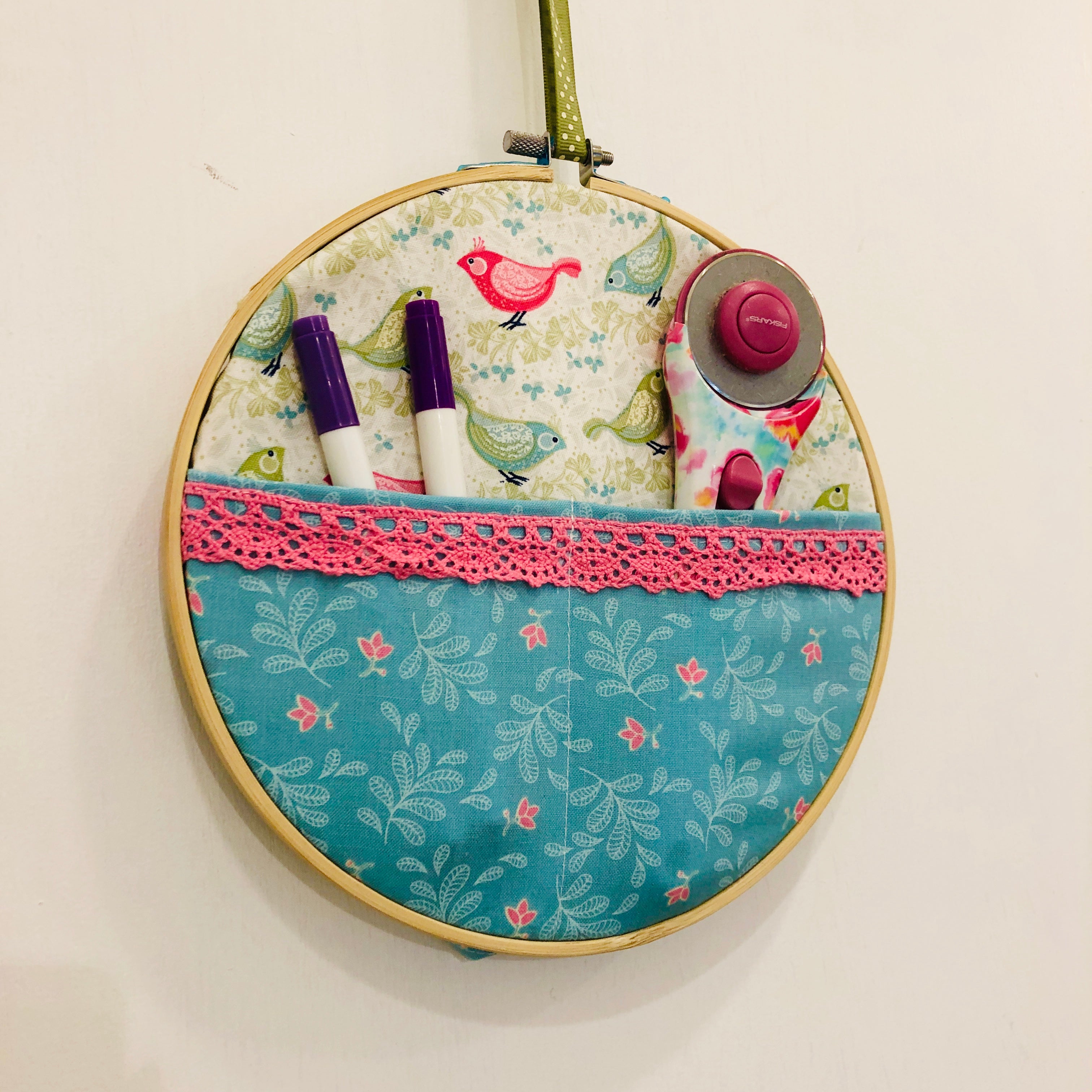 Make a sweet little hanging hoop organiser for your sewing space, or to store other essential items within easy reach. This pattern is a great project for all levels, suited for beginners or as a quick project for more advanced stitchers.