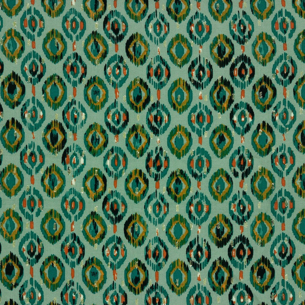 Swish around in style with this stunning viscose that has a delicious drape and is perfect for drapey skirts, elegant summer dresses and easy breezy tops. The fun ikat design is set in gorgeous shades of muted teal, rich turquoise and earthy rust, finished off with gold lurex dashes here and there to pick up the light!- Composition: 90% viscose, 10% lurex