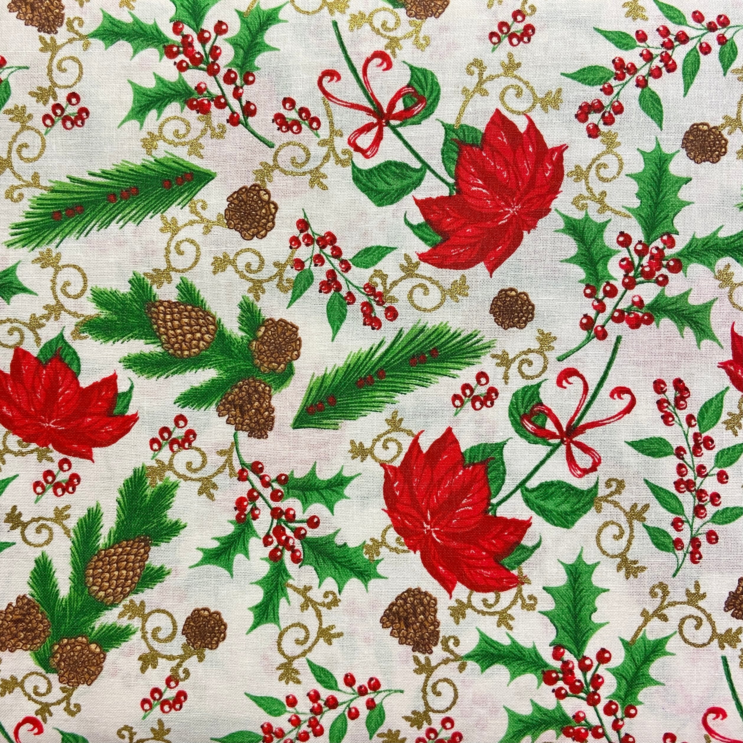Get festive with these fun prints from Kingfisher fabrics! This stunning seasonal design features classic poinsettia, holly, pine cones and foliage all in a traditional style, finished with gold metallic touches. Great for quilts, table runners, gift bags, garments and more!