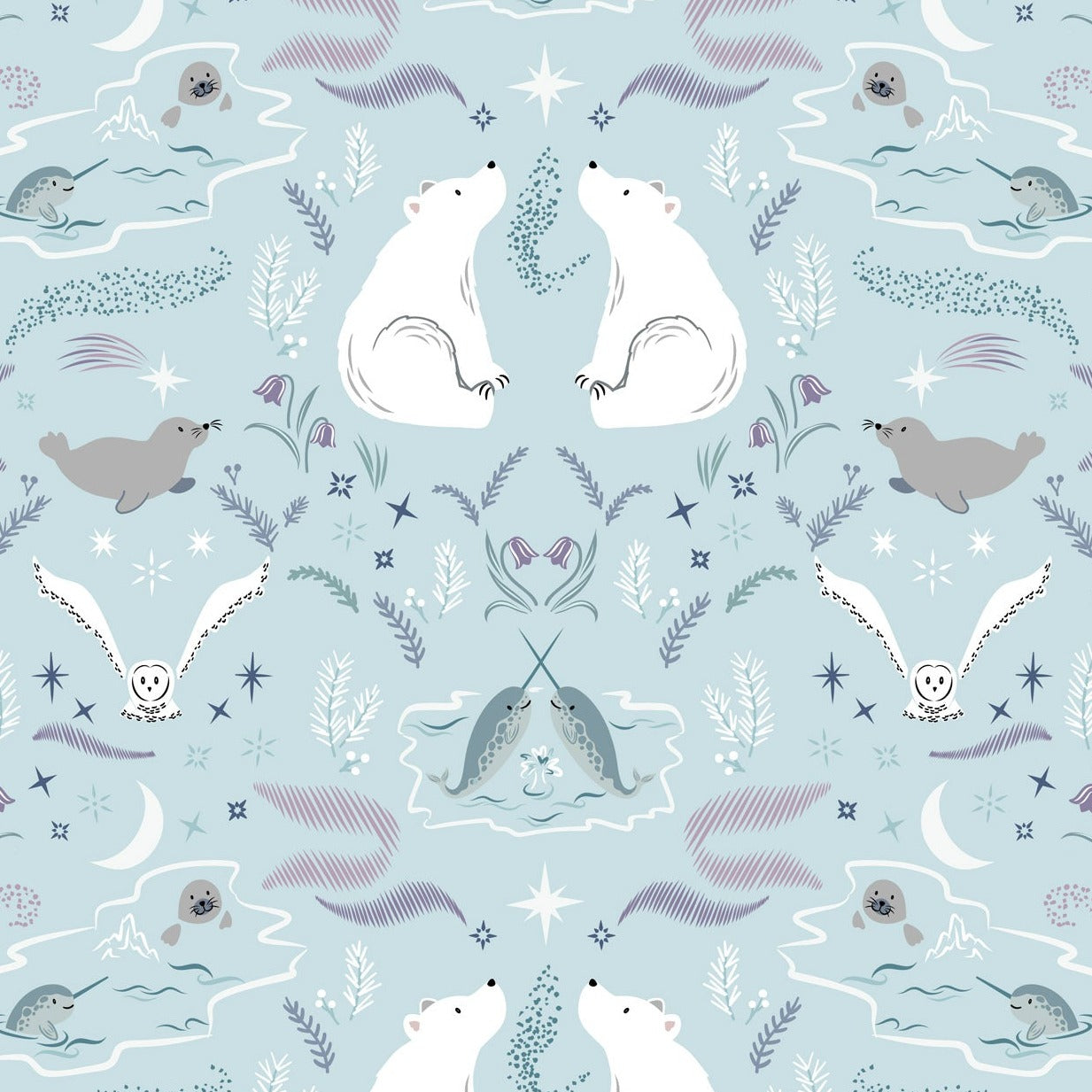 Explore the magic of the arctic circle with this wintry collection designed by Cassandra Connolly for Lewis & Irene. Designed in cool wintry shades of blue and grey, this collection is finished with glistening pearlescent detailing for that extra special touch - just like snow glistening in the sunlight! The print features sweet little polar bears, baby seals and magical narwhals playing with each other in the icy ocean.