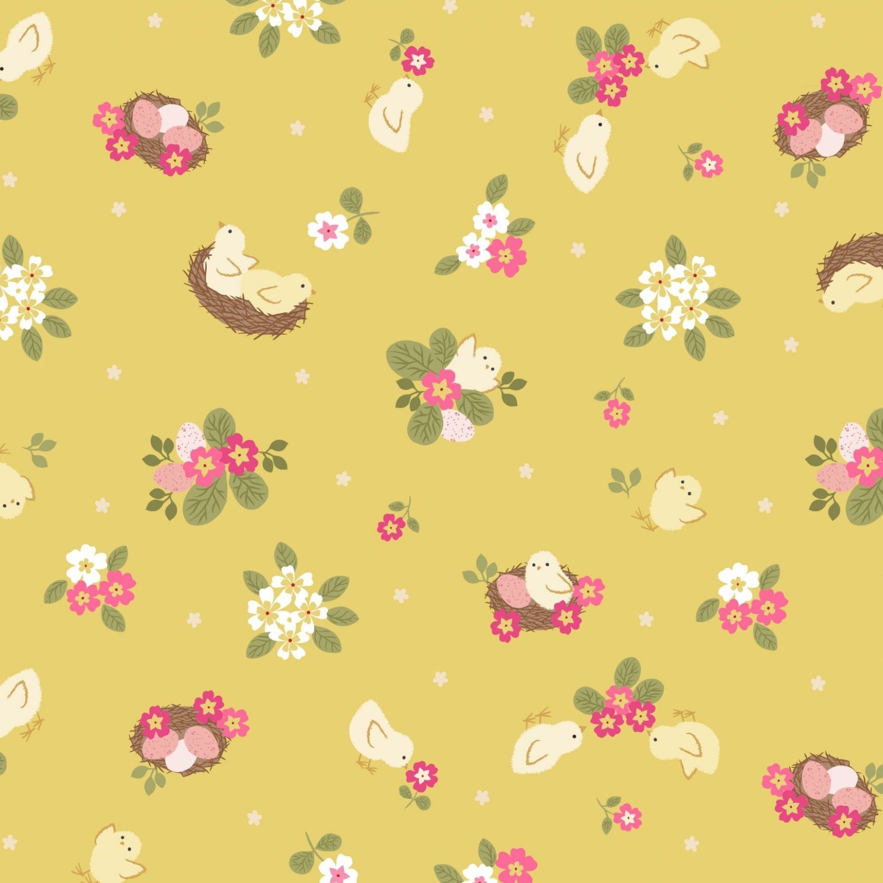 Hop into that spring feeling with this sunny and fresh set of prints from Lewis and Irene! Bunny hop is full of cute chicks, bouncing bunnies and fresh floral designs... This sweet design features chirpy chicks exploring their nests and around, taking their first fuzzy steps! Great for patchwork and quilts, clothing, home accessories and more!