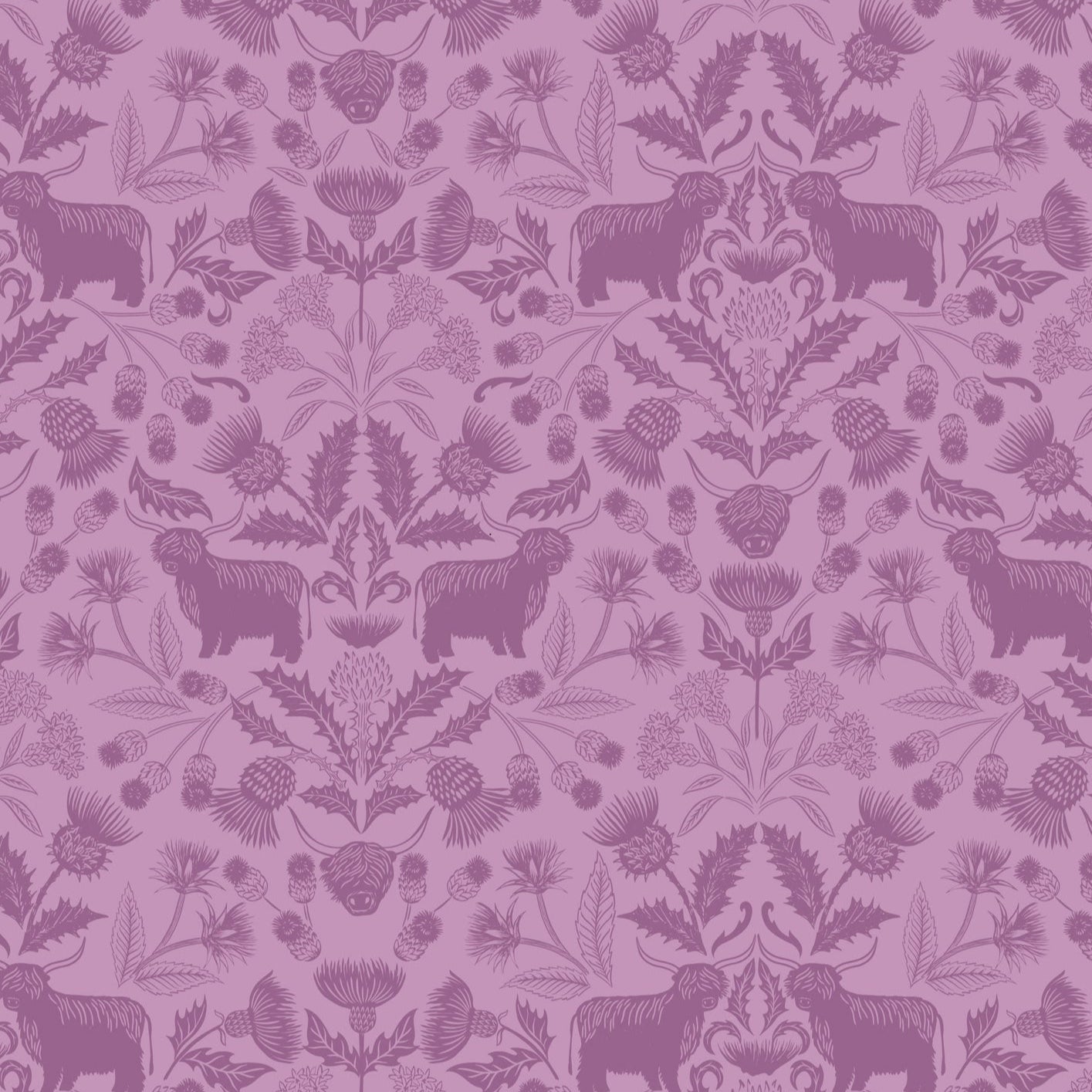 This simple print is designed in a silhouette style for a toned-down but interesting print, with bow fluffy little cows and delicate thistles on a smaller scale. Great for linings and backings that want something a little more muted but not plain!