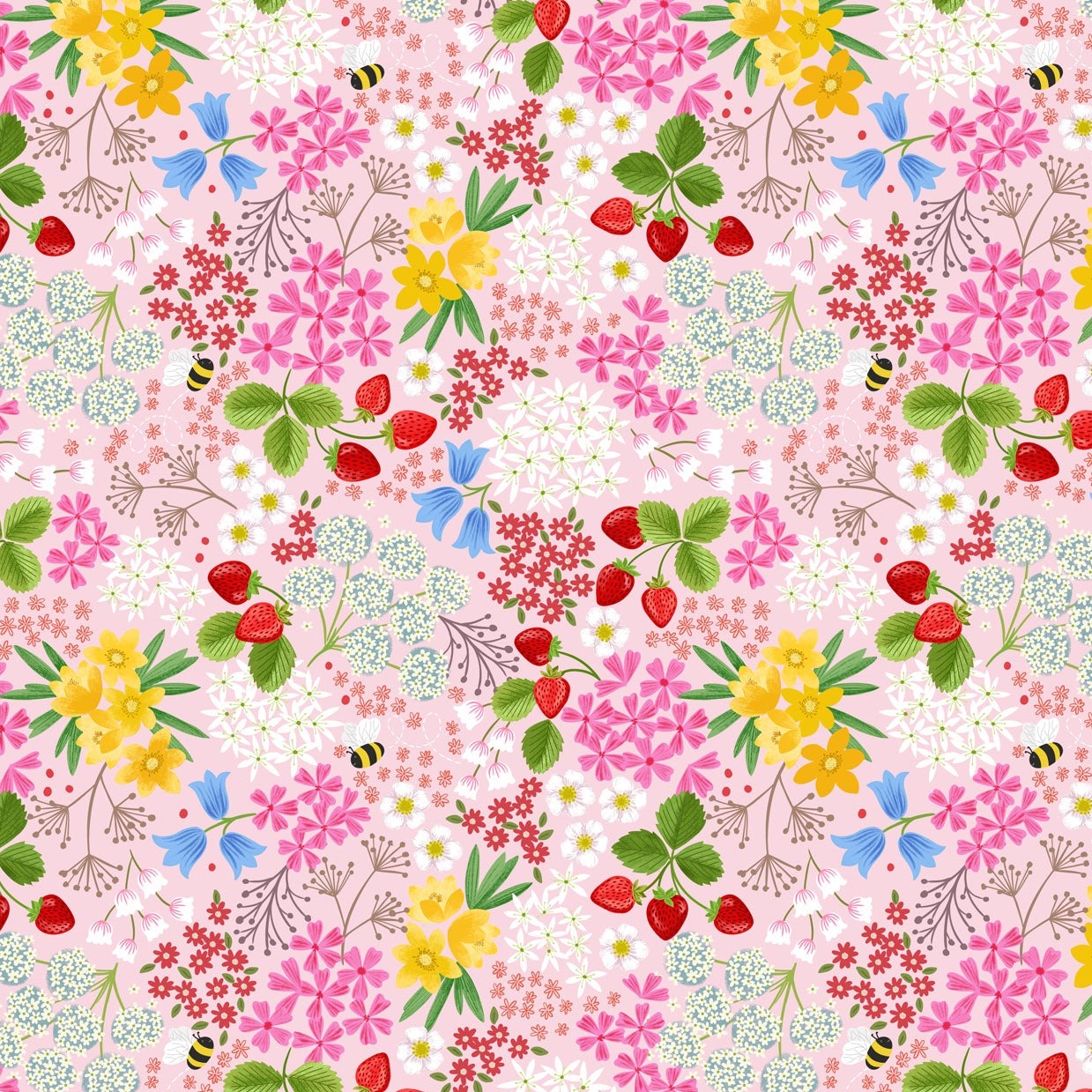 Lewis & Irene Teddy Bears Picnic - Strawberry Bee Floral Pink - 100% Cotton Fabric