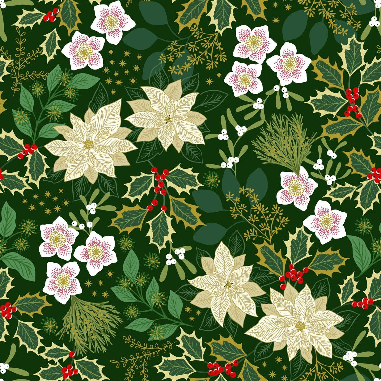 Lewis & Irene Yuletide - Festive Floral Green (metallic) - 100% Cotton Fabric