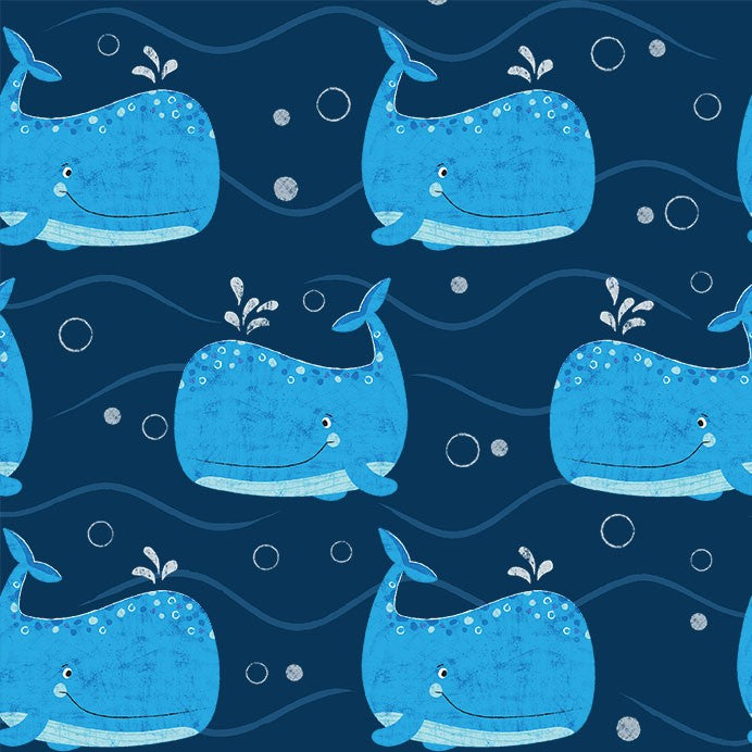 Add a splash of seaside style to your project with this sweet underwater set of prints from Michael Miller. Under the Sea features all your favourite friendly sea creatures from fish and turtles, to crabs and whales - in a classic deep blue, orange and green colour palette that kids will love. This cute print has some super adorable gigantic whiles showing off their gentle nature. Perfect for quilting, patchwork, accessories, home sewing and even clothing...