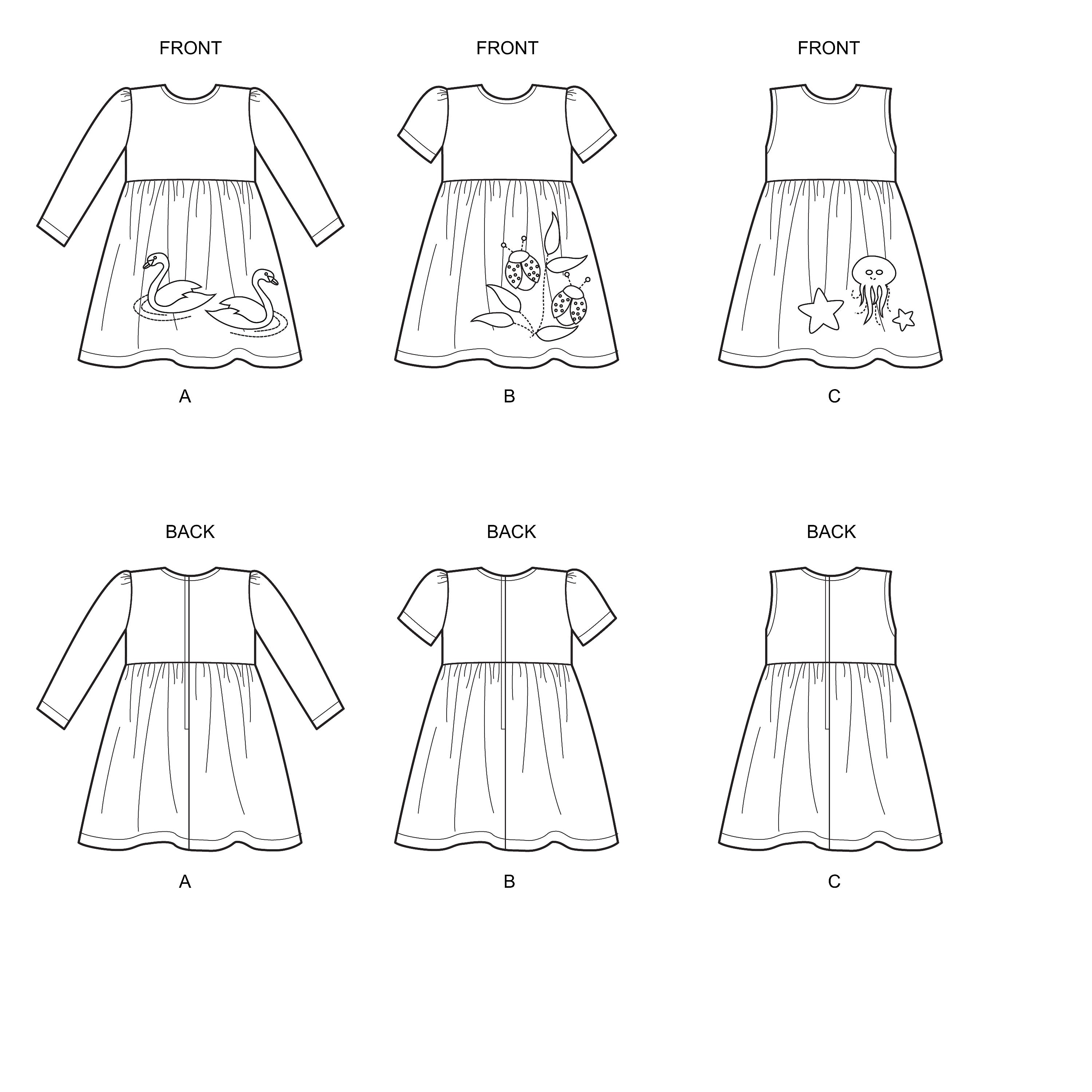 Toddlers' dresses. Skirts gathered into raised waistline. Sleeveless, short or long sleeve variations. Zip fastens at back. Swans, Lady-bug and leaf, Jellyfish and Starfish Applique options.