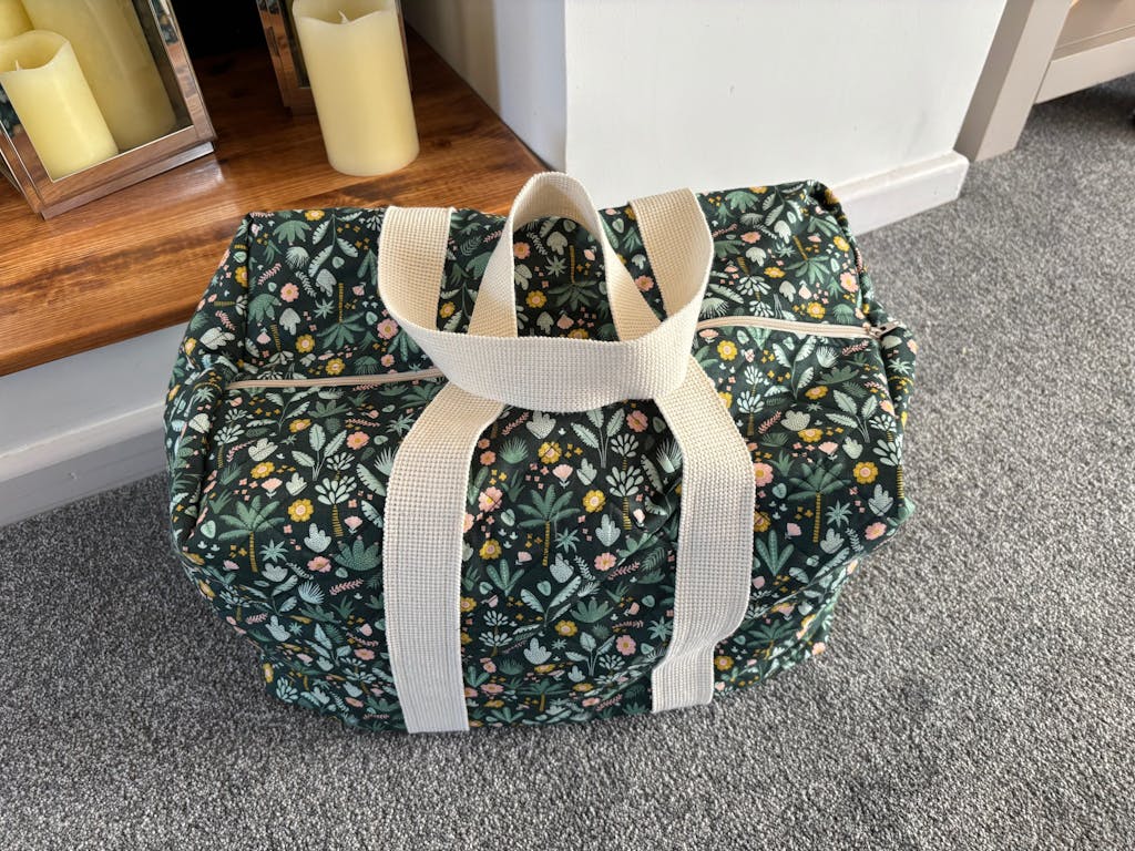 - Materials in box: fabric as shown, wadding, zip, webbing and co-ordinating threads in two colours.
