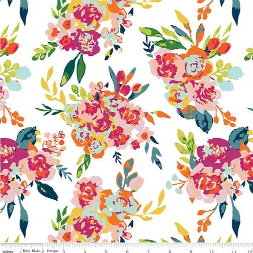 Classic florals get a bold twist with this punchy set of prints from Riley Blake's Garden Party collection. It celebrates the riot of colour that escapes into the garden in the summer months, all finished in a hand-illustrated style. This stunning centrepiece print is bursting full of bouquets in a rustic-painted style, in summery shades of pink and orange. Great for a colourful quilting project, clothing or accessories!