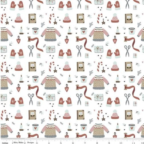 Send some warm winter wishes with this cute collection from Riley Blake. This sweet print features all those classic icons of a cosy Christmas evening, from Christmas jumpers and woolly mittens to hot chocolate and a good book by the fire. Great for everything from Christmas quilts to table runners, stockings to gift bags.