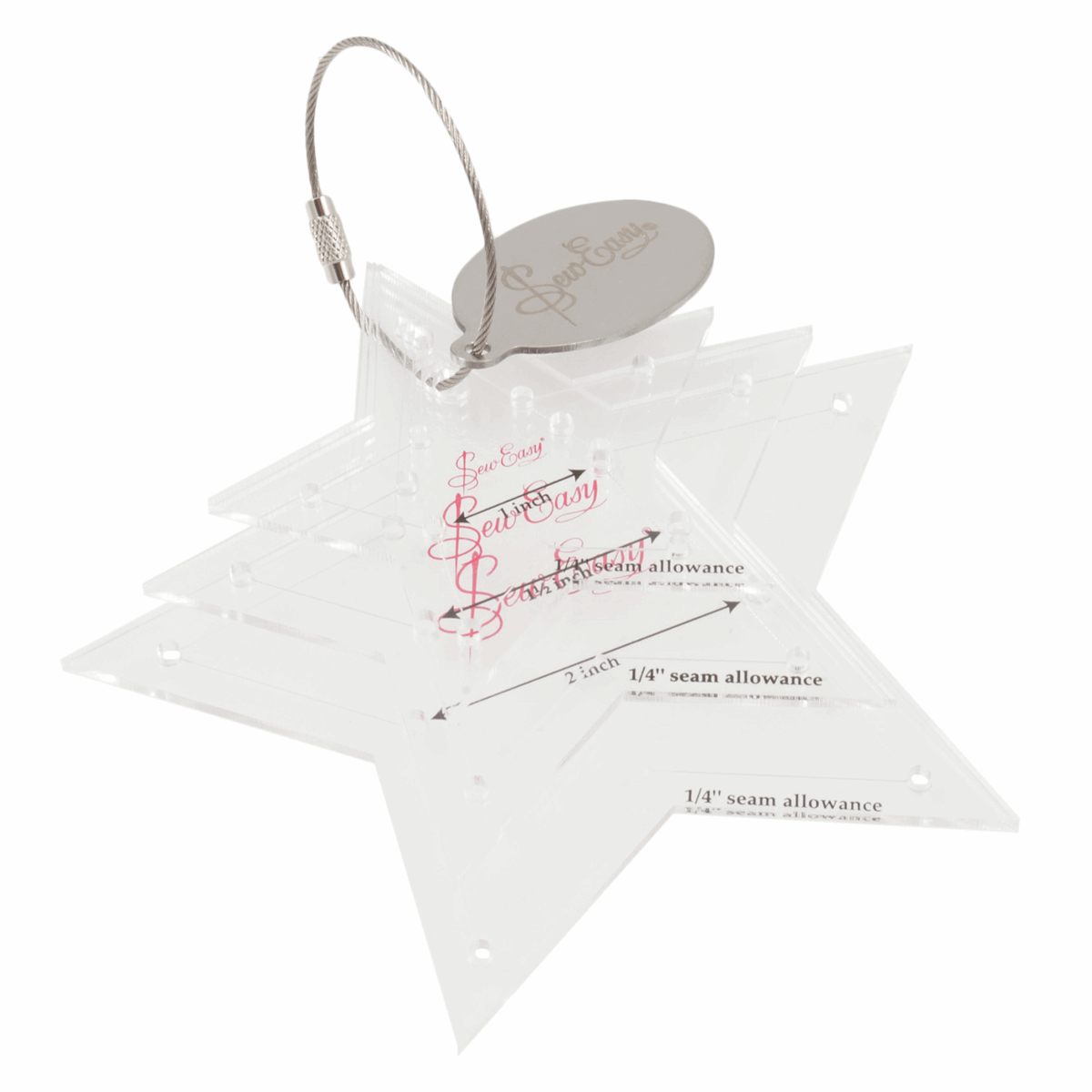 Cut quickly, accurately and professionally with a set of acrylic templates. This set features a range of different size stars varying from 1" to 2" in size, all with an in-built seam allowance of 1/4" for making life easy. They are completely clear which makes them easy to use, and feature little holes that are ideal for hanging them upon hooks or keyrings, as well as ease of marking your seam allowances.