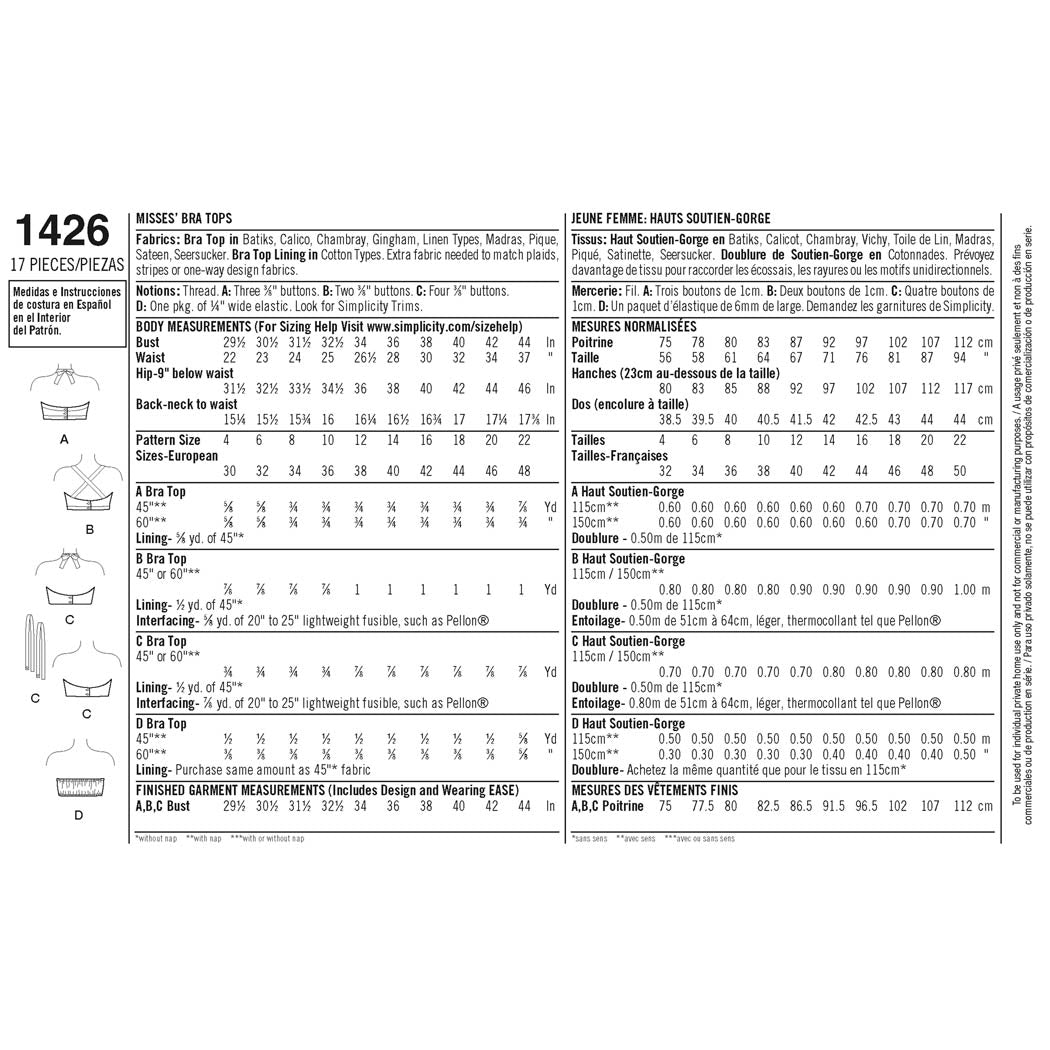 Simplicity Sewing Pattern 1426 - Women's Vintage 1950's Bra Tops