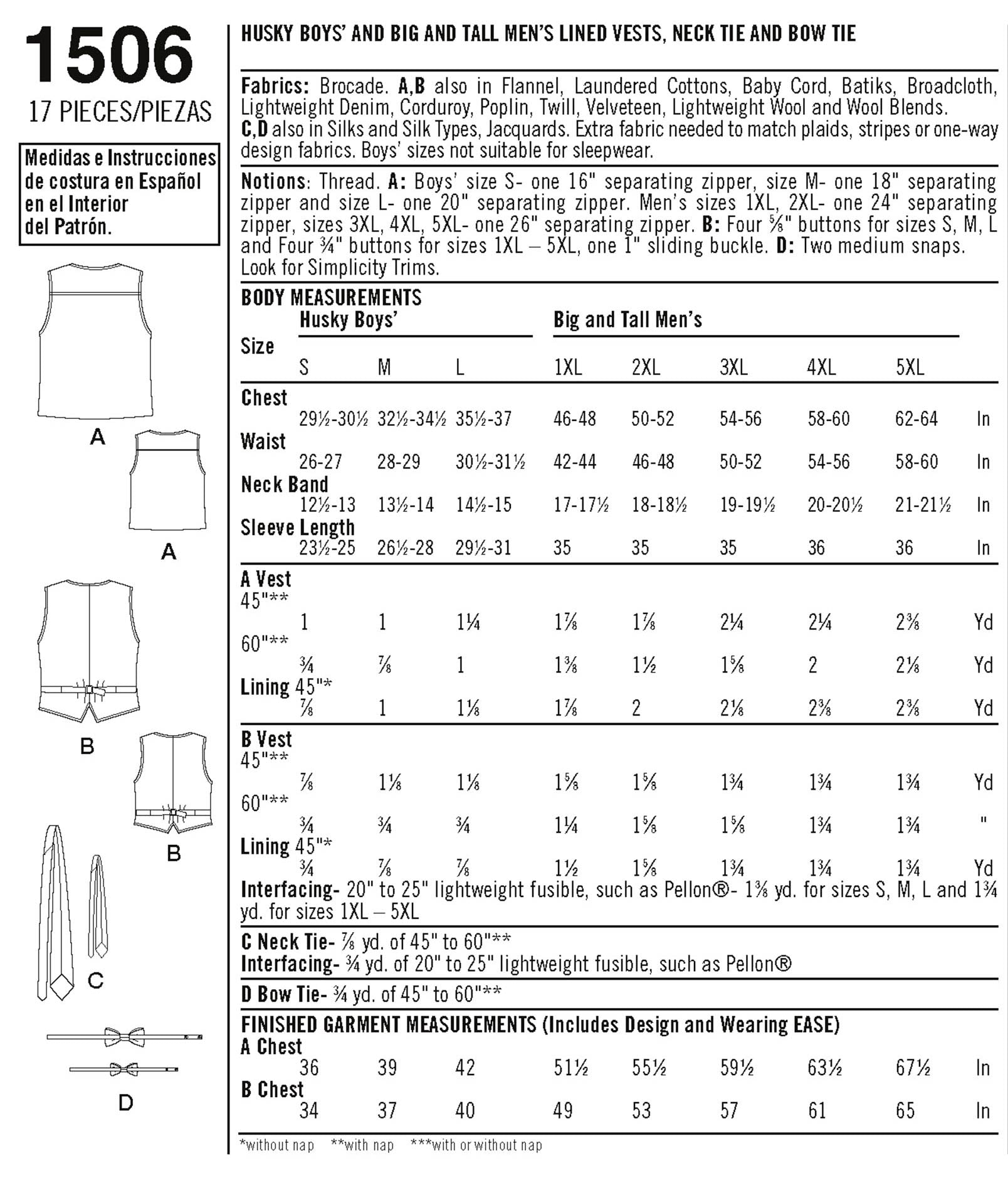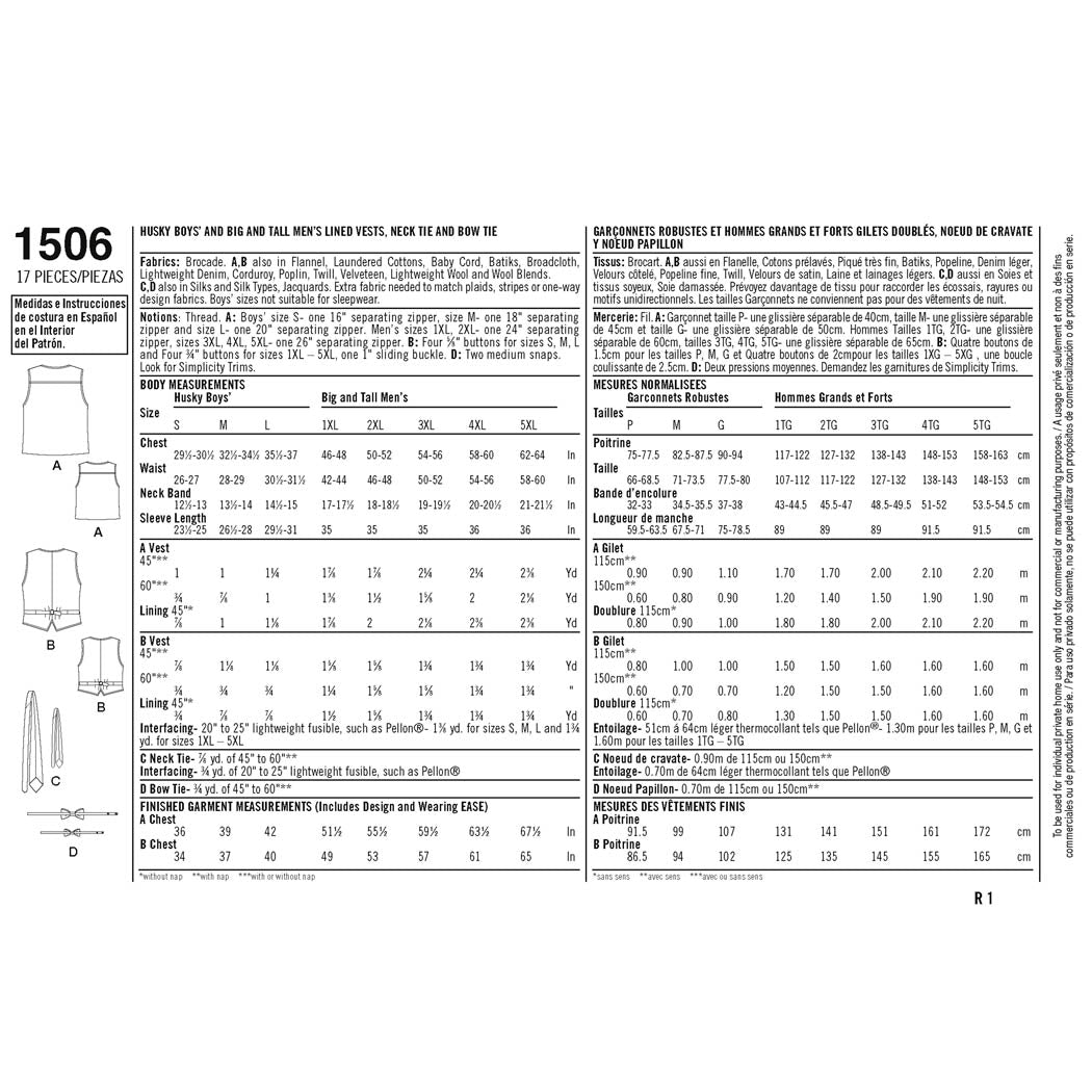 Simplicity Sewing Pattern 1506 - Husky Boys' and Big and Tall Men's Vests