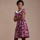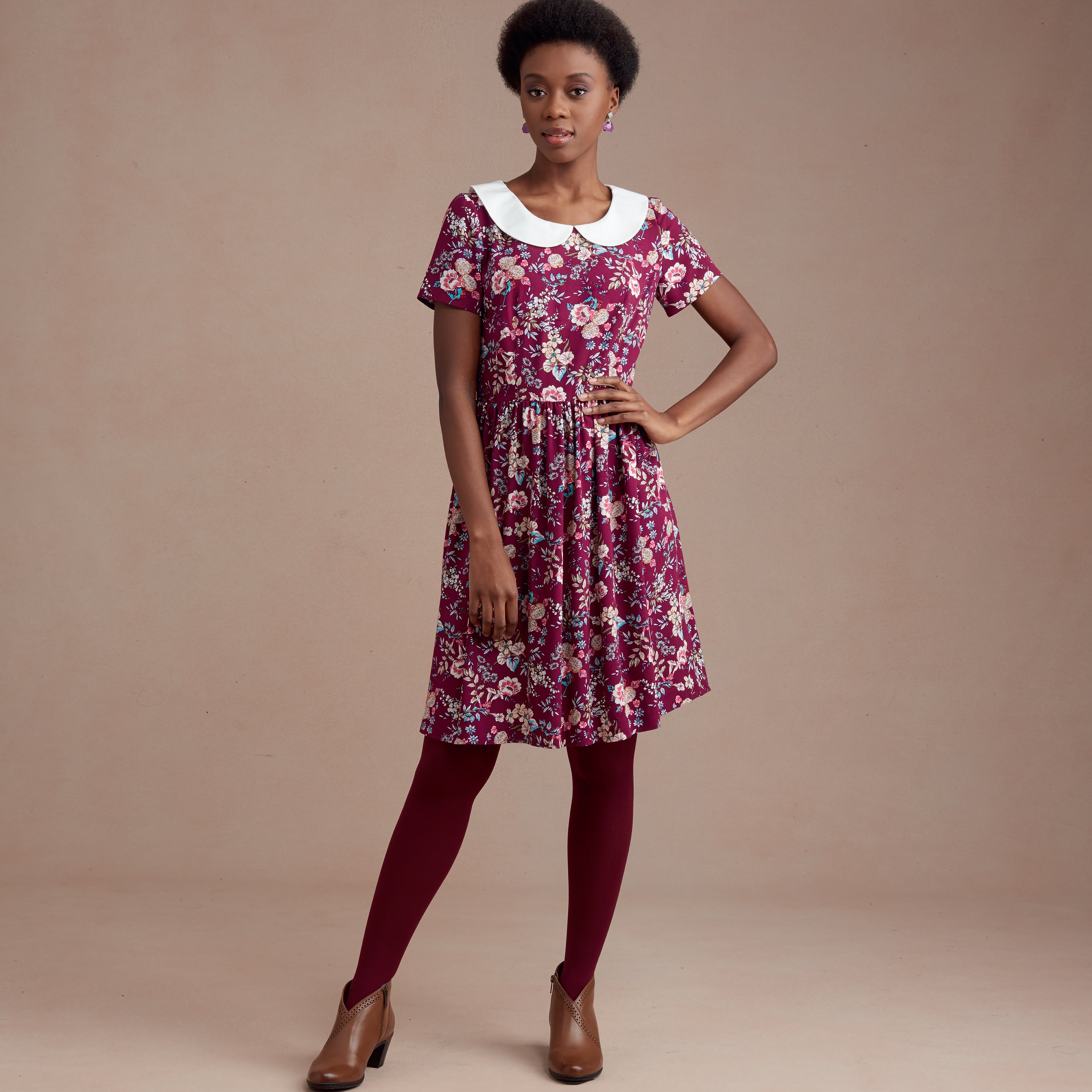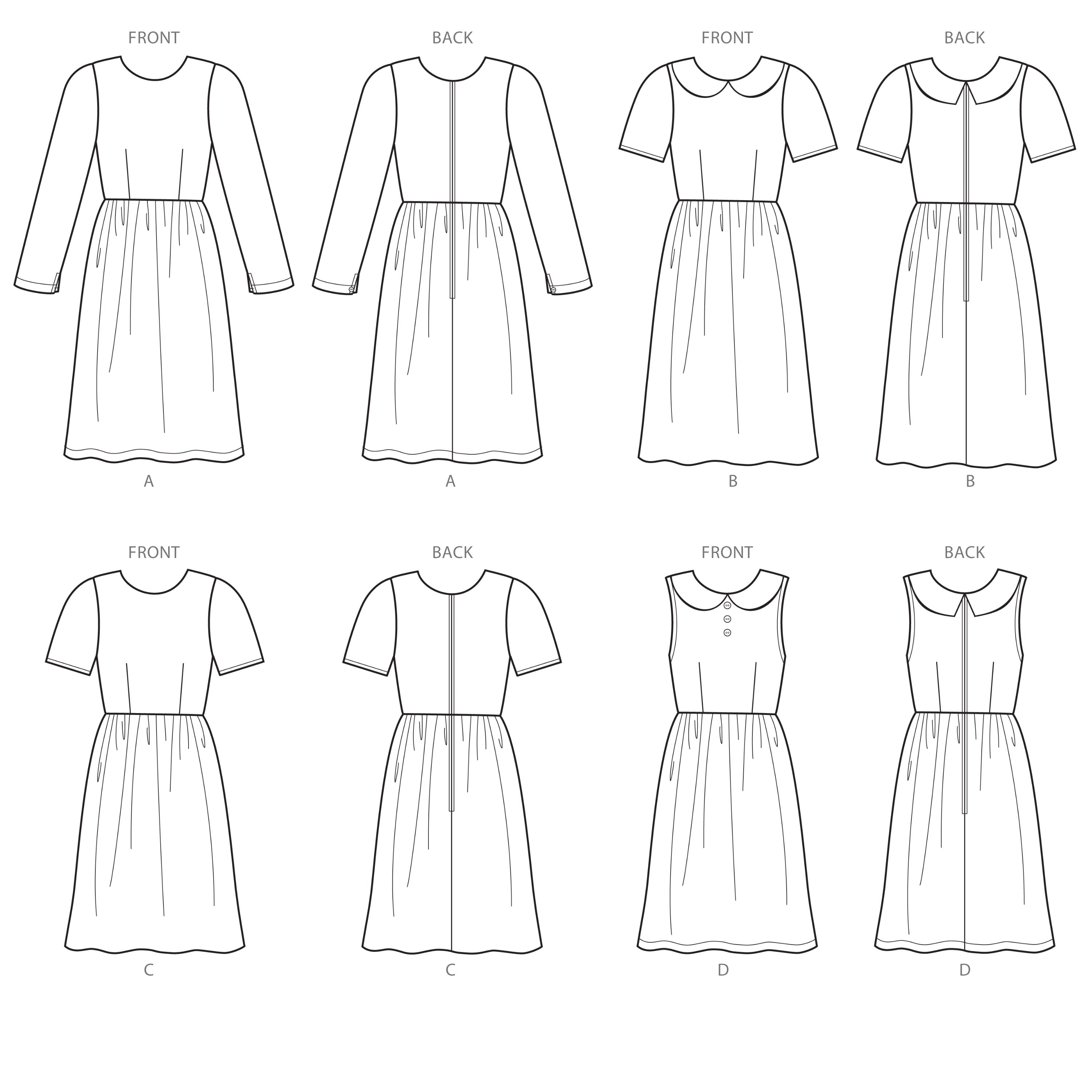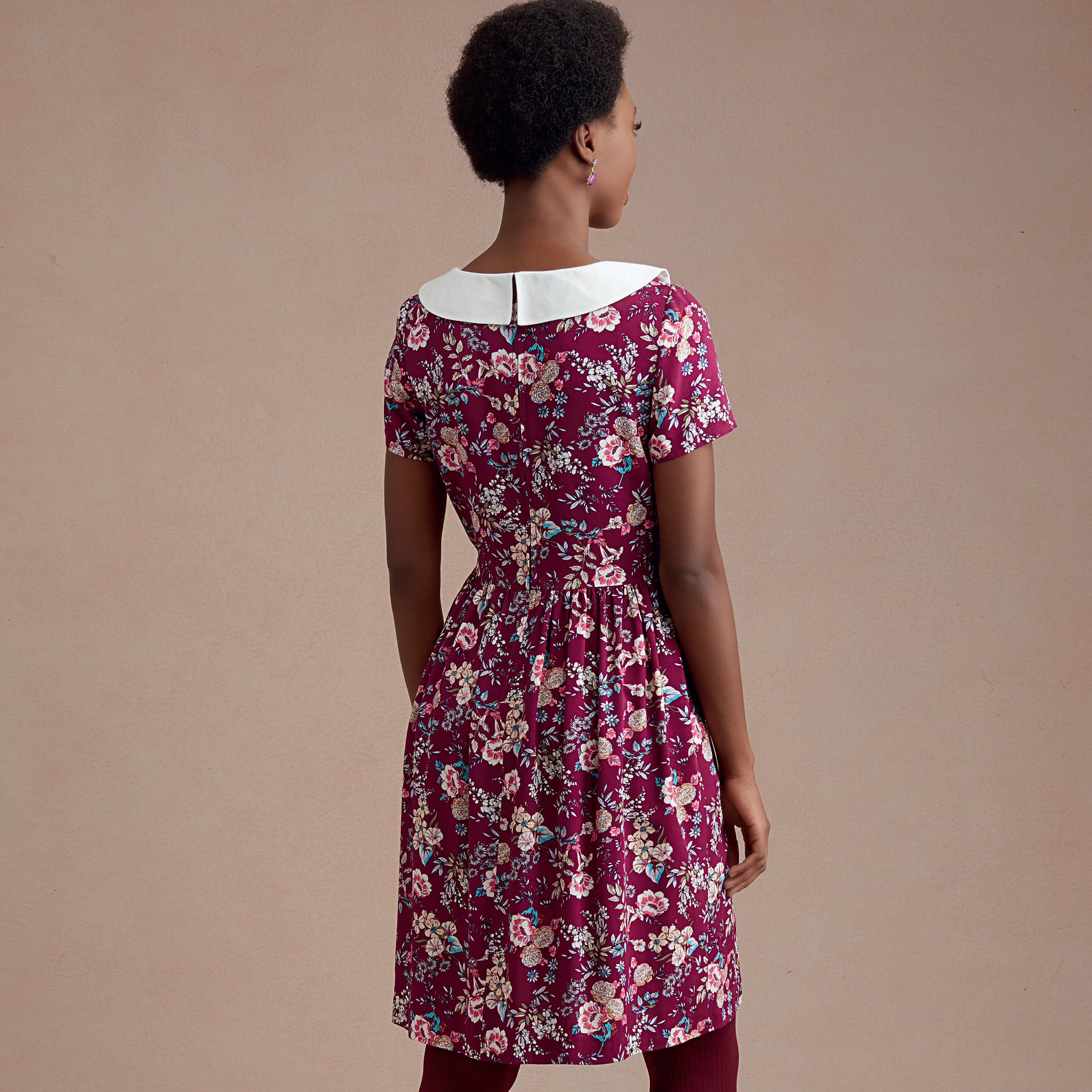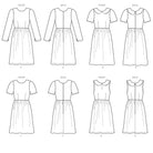 Demure ‘baby-doll' dress with skirt gathered at waistline seam. Sleeveless, short or long sleeves. Collar and dress length options. Fastens at back. Suitable for woven or jersey knit fabrics.