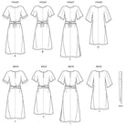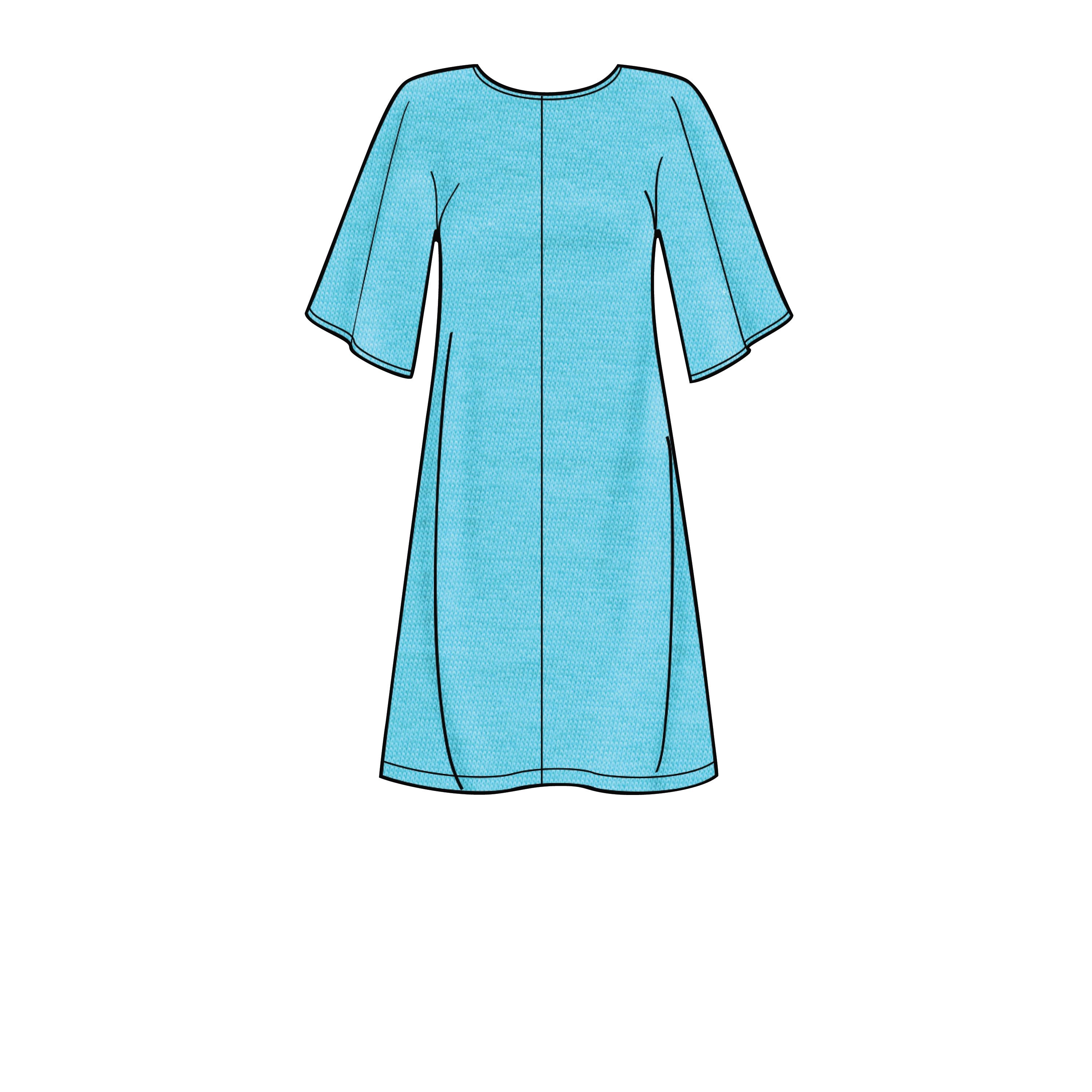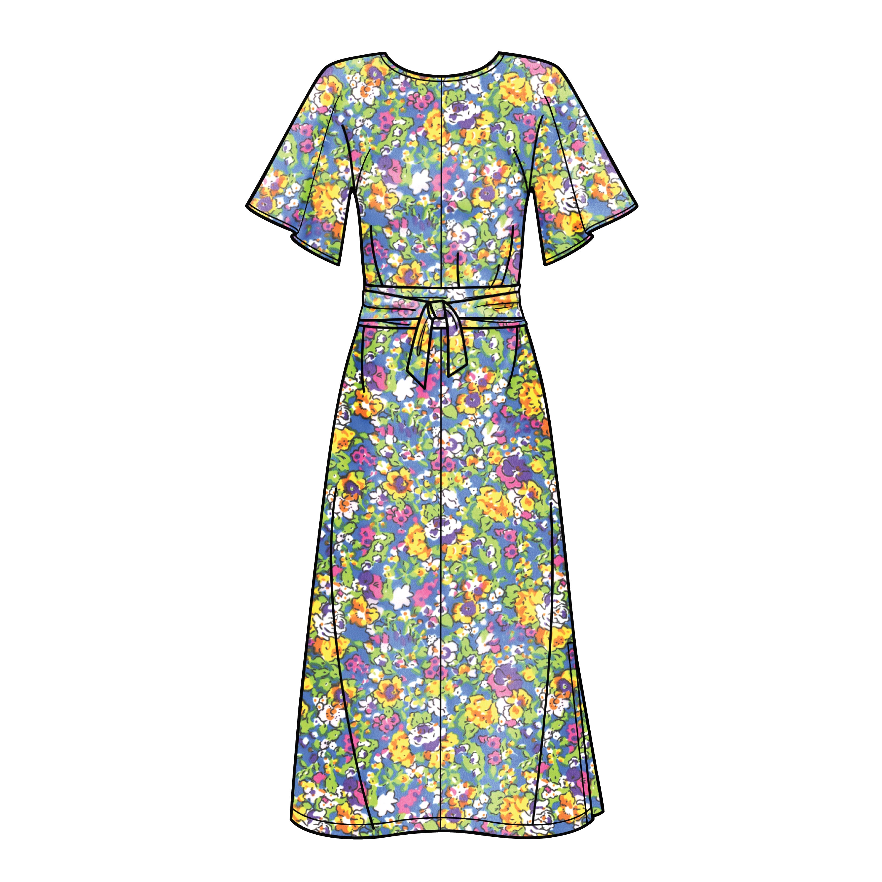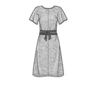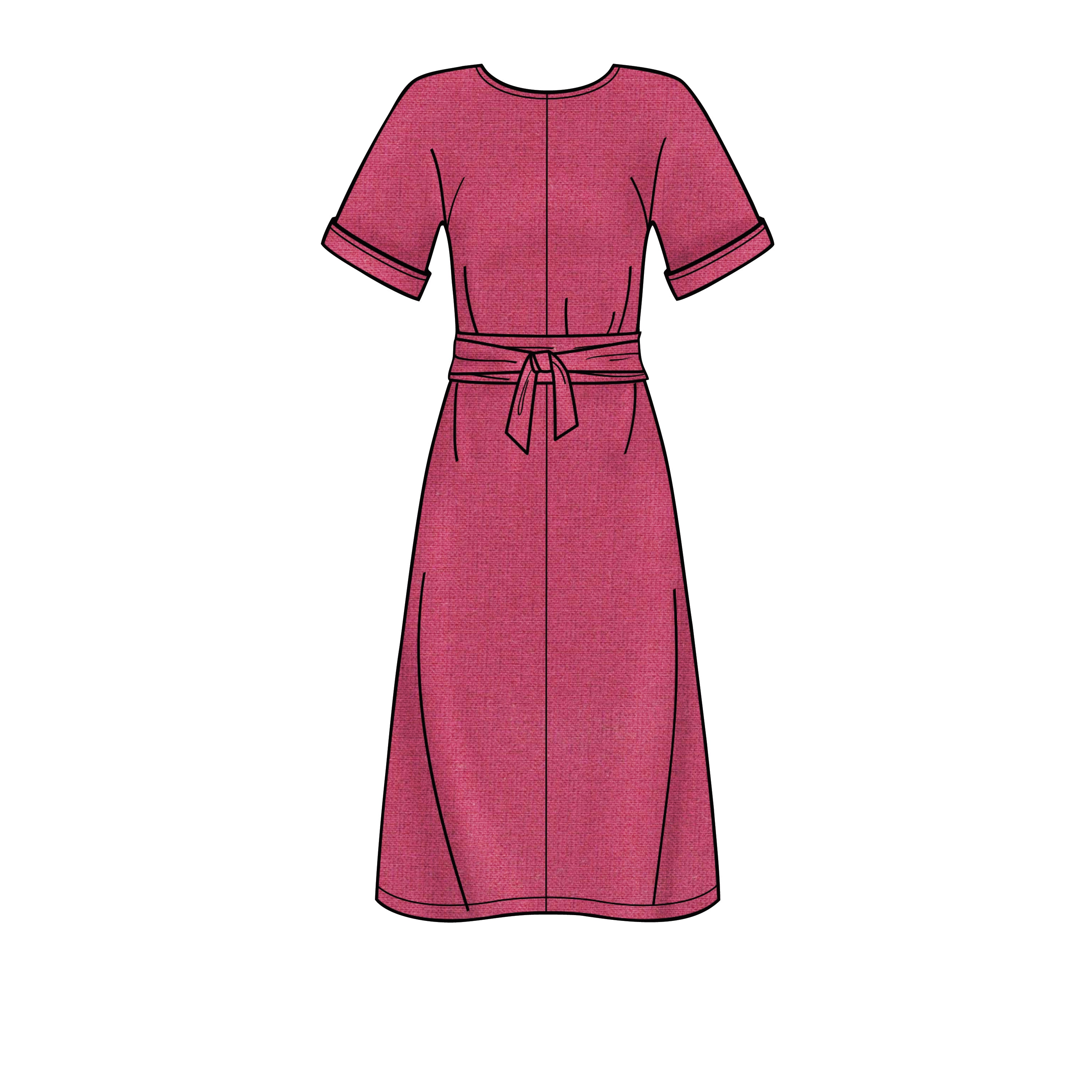 Easy to Sew Misses' Dresses. Pull-on style with centre front and back seams, fastens at back neck. Obi-style belt. Dress and sleeve length variations. Suitable for light-to-medium weight fabrics.