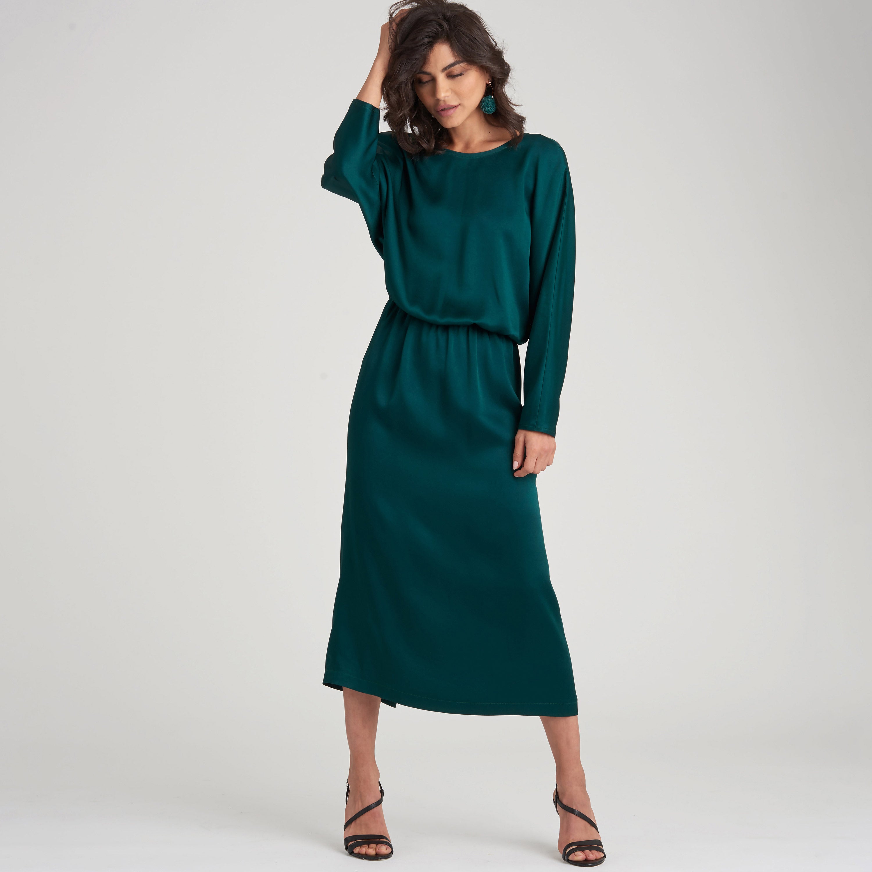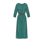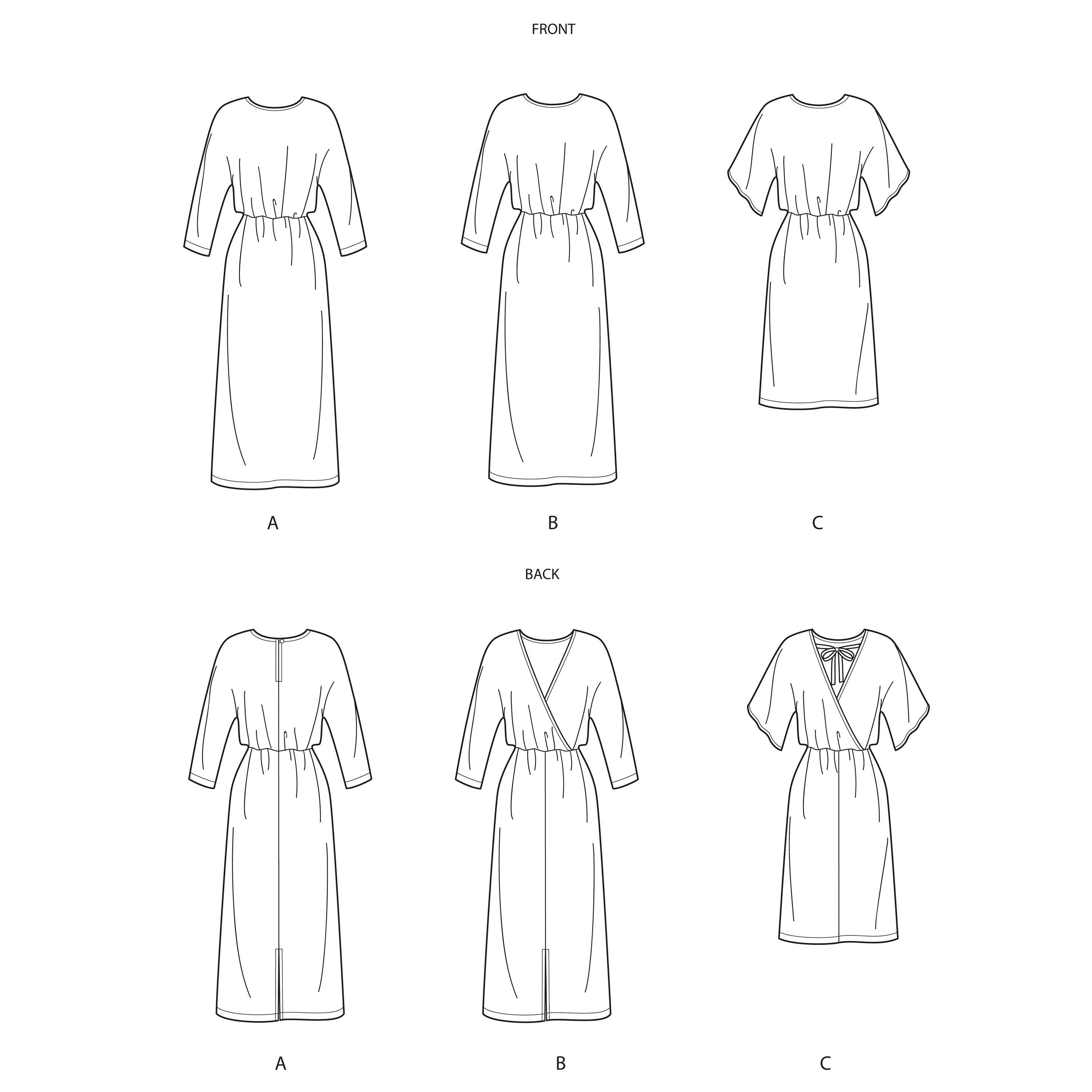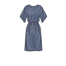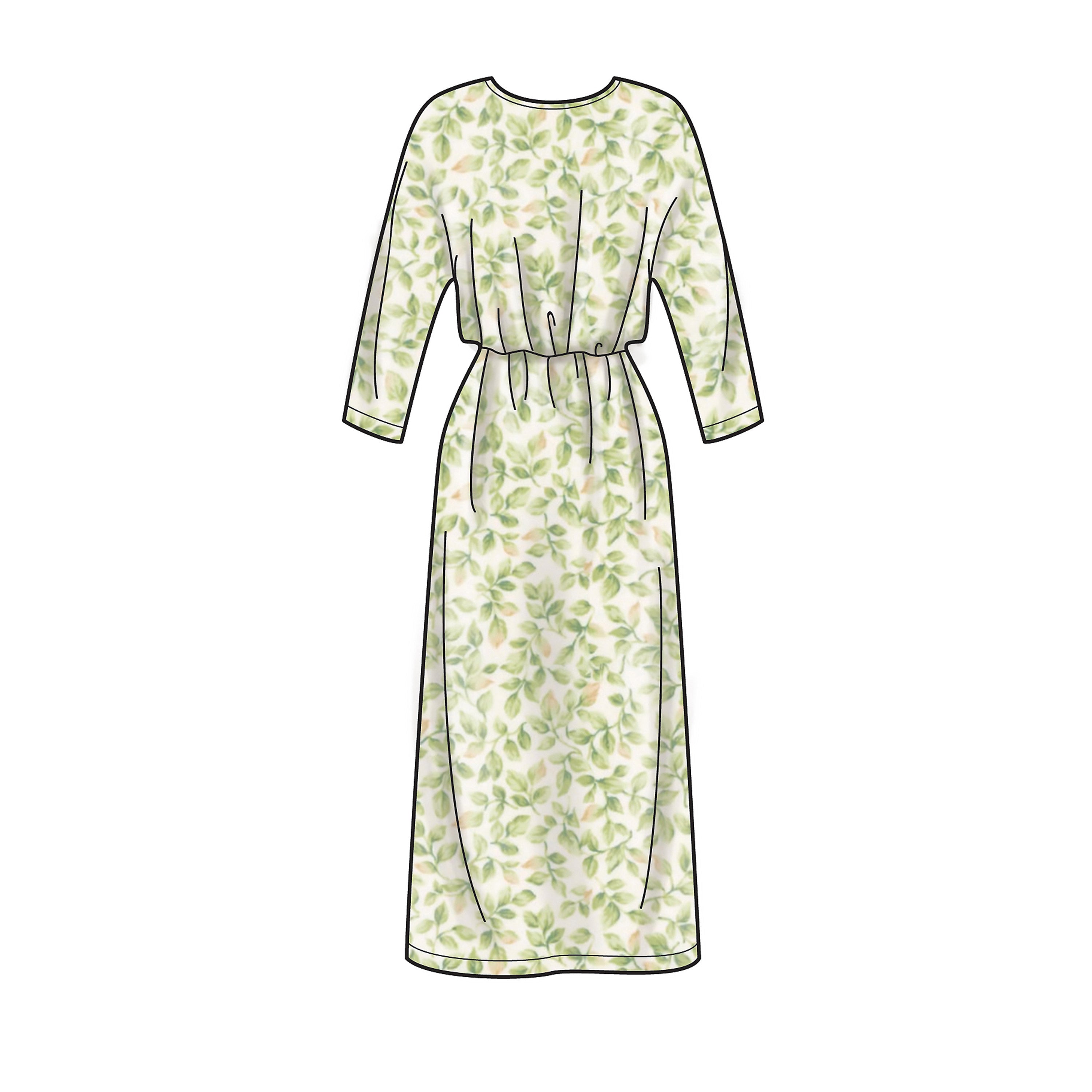 Loose-fitting dresses with elastic waist and grown-on sleeves. Options include cross-over back neckline and short or midi-length. Suitable for woven fabrics.