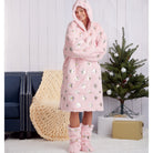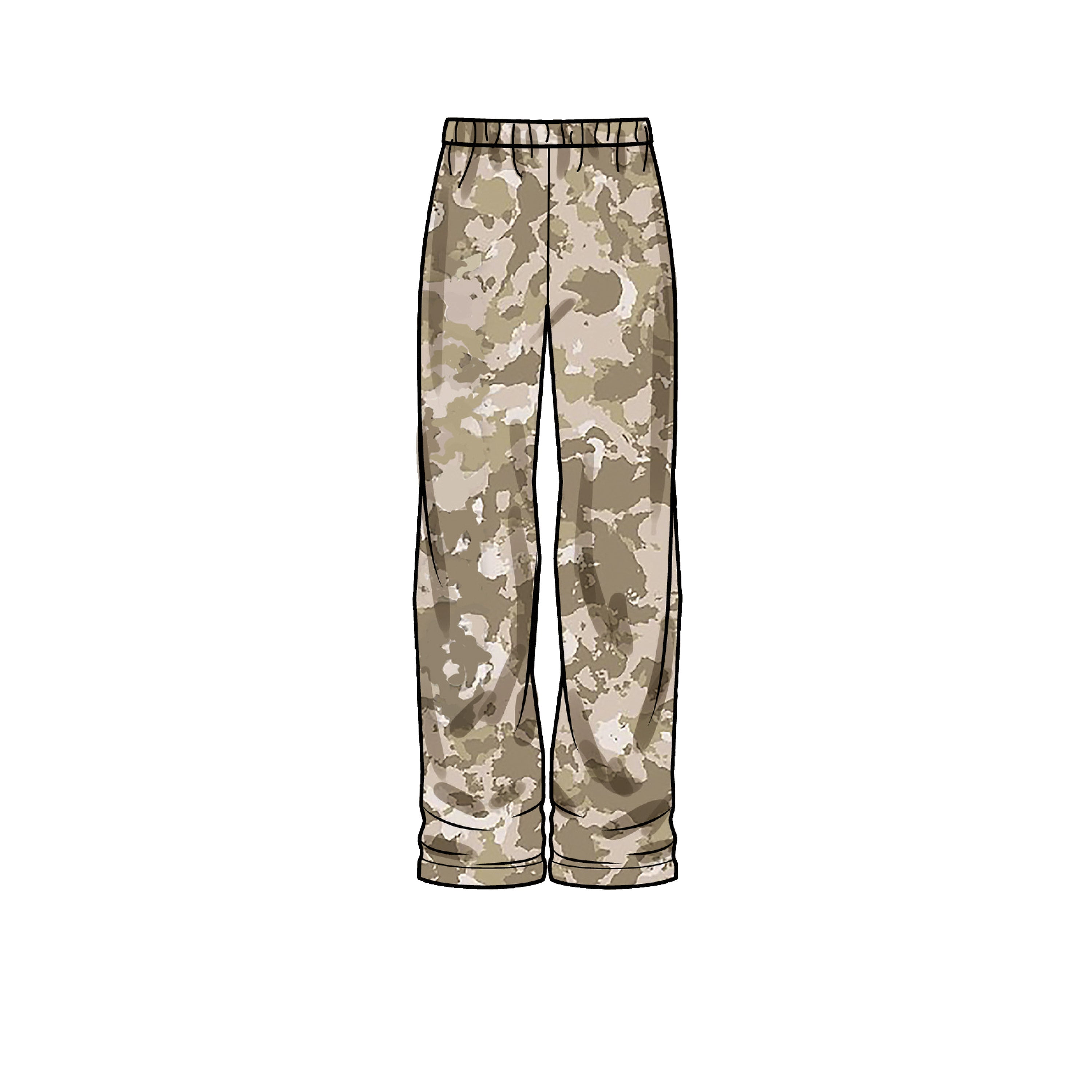 Oversized pull-over in two lengths can be made with or without hoodie. Option for oversized front kangaroo pocket. Pull-on pants have elastic waist and side seam pockets. Fleece lined booties have ties drawn through casing at top of bootie. Booties in sizes S, M and L.