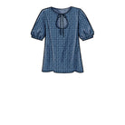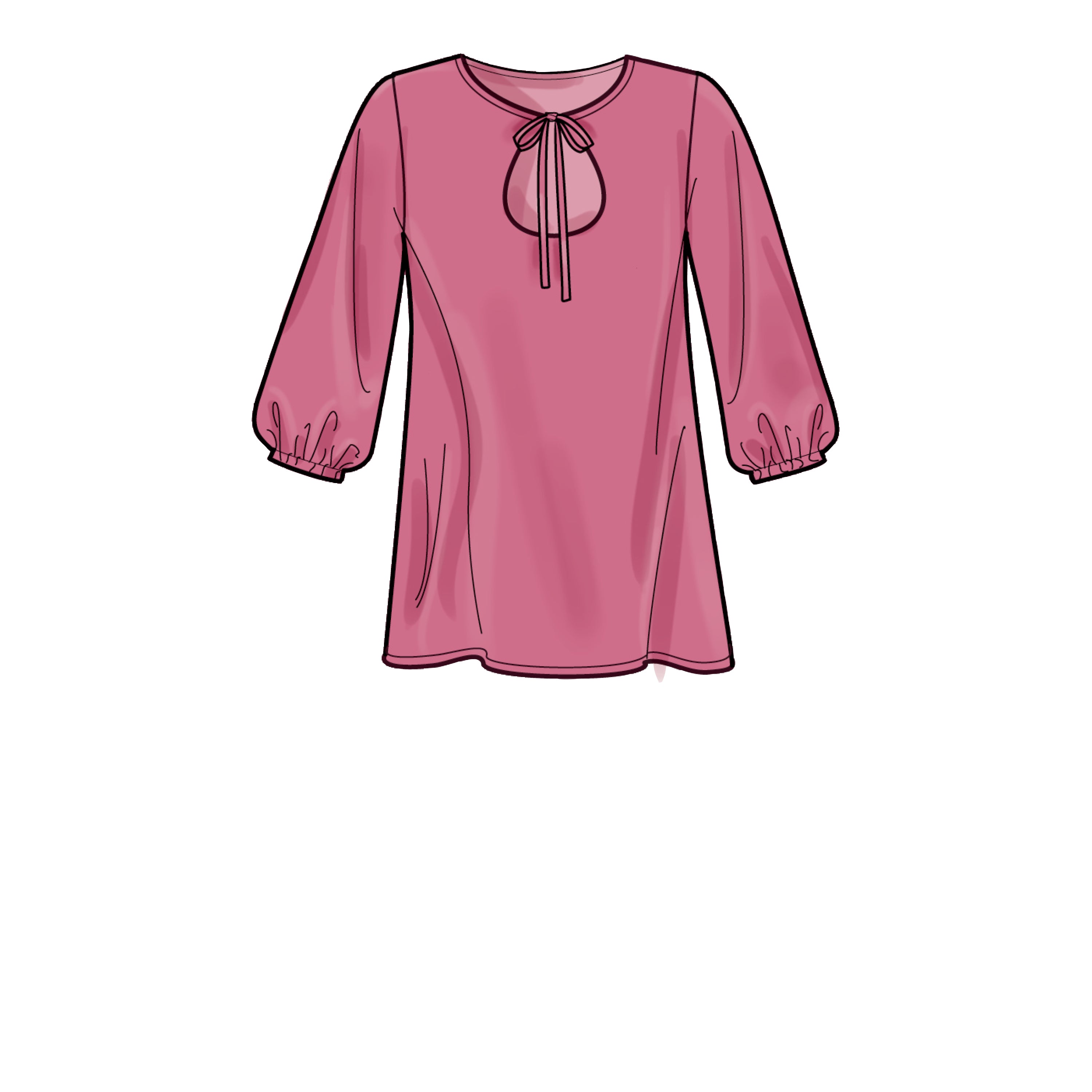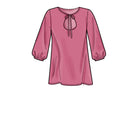 Pullover tops in tunic or hip lengths feature V-shaped and cut out necklines with self ties. Three-quarter and elbow length sleeves gather to elastic. View B has waistline elastic creating peplum look.