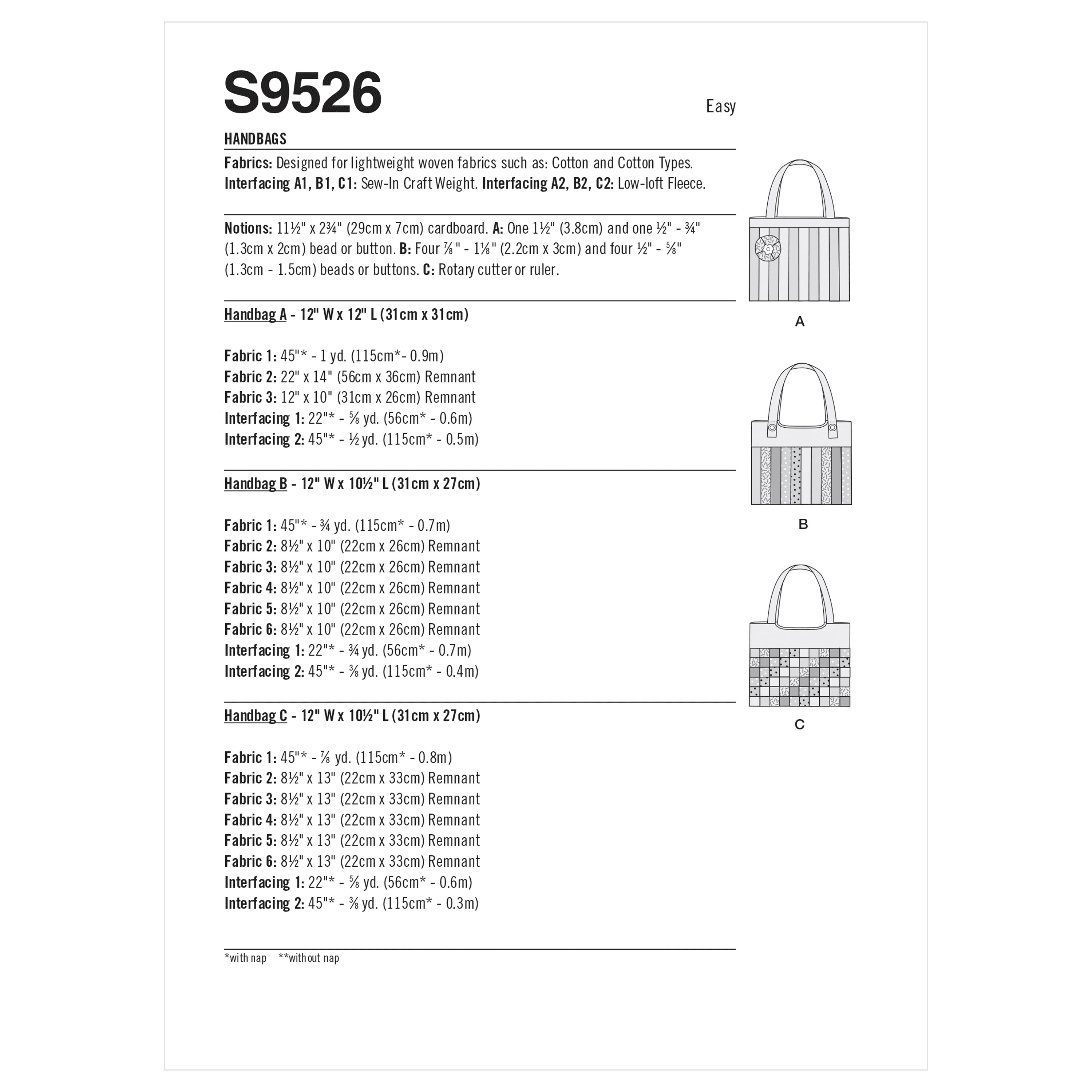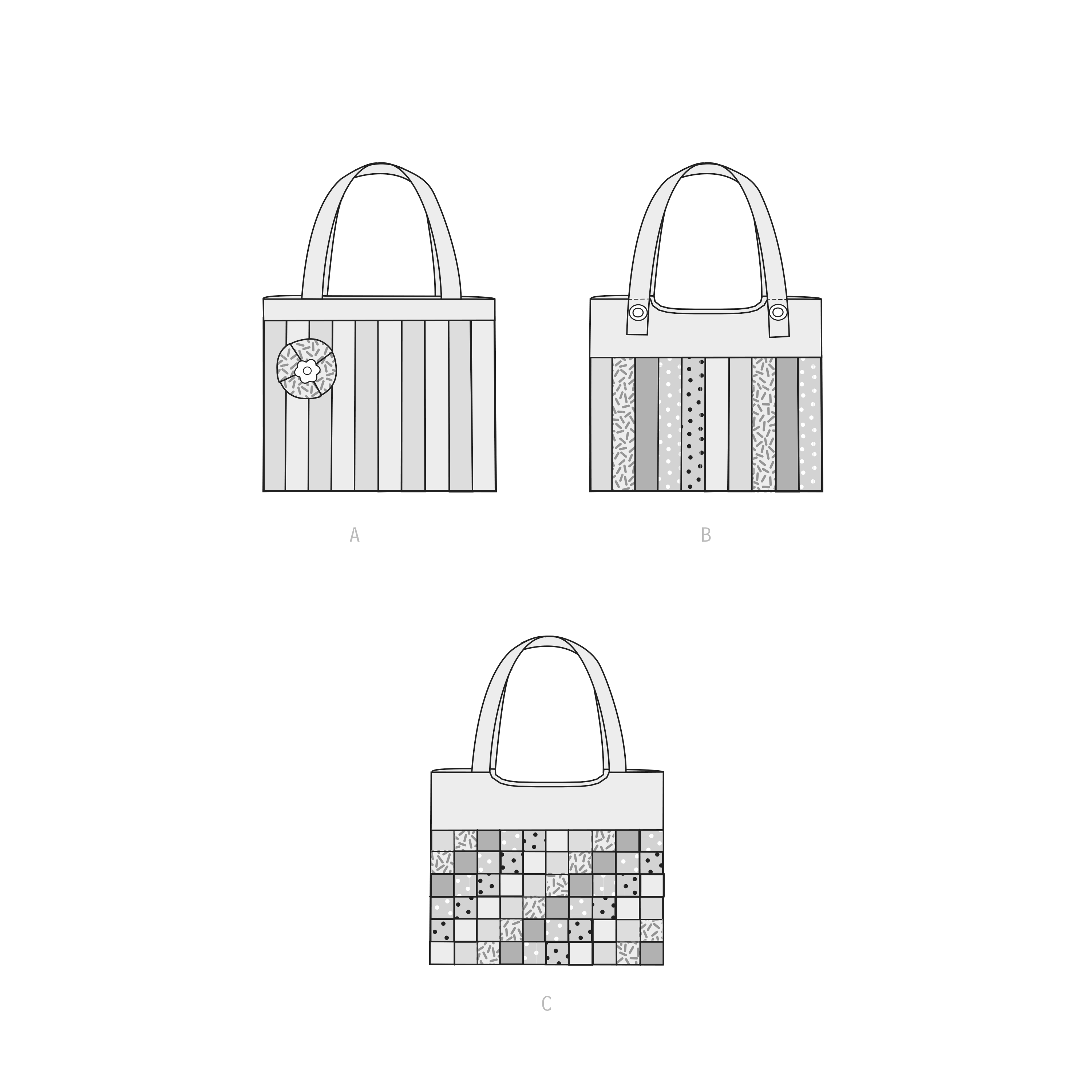 These quilted handbags are fashionable and fun to make. Using a variety of your favorite fabrics, you can create a bag you're thrilled to wear. Bag A is 12" (31cm) x 12" (31cm), bags B and C are 12" (31cm) x 10.5" (27cm).