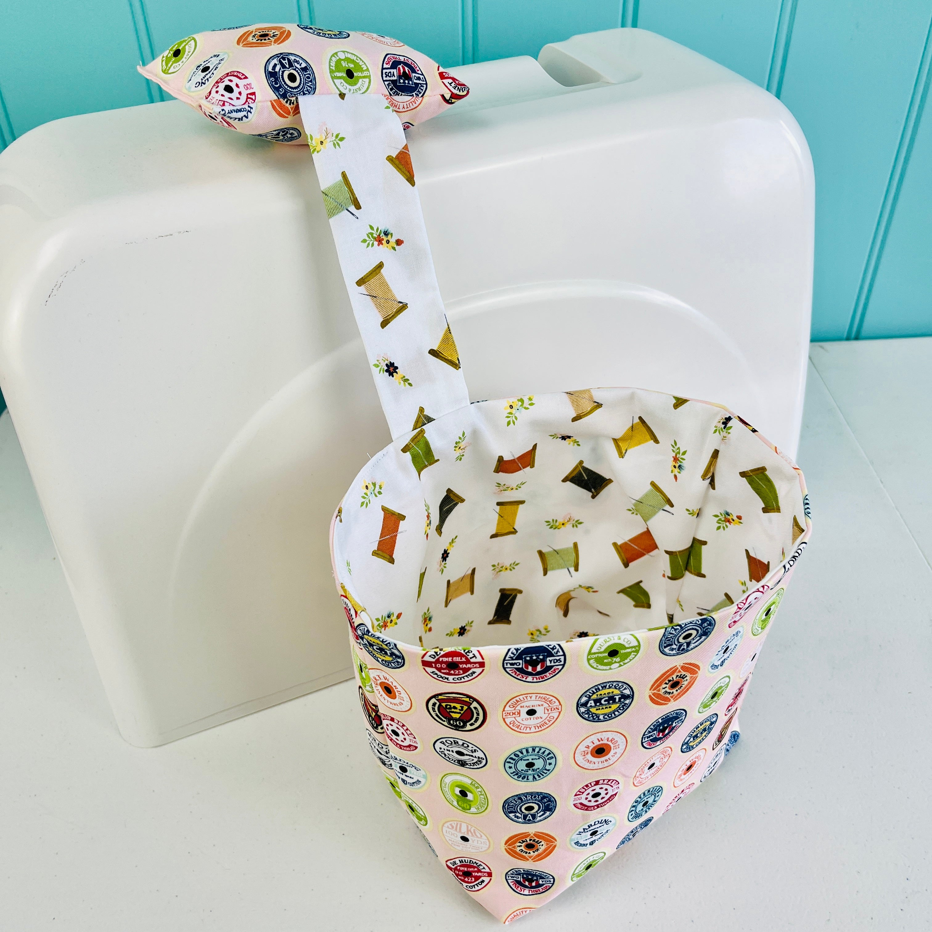 This handy thread catcher project is there to keep your sewing space neat and tidy! Designed to hang off the table top next to your machine, use it to catch all those scraggly thread snippings and tiny fabric cuttings as you're making to help keep the floor clean, and your sewing area free from mess. Plus it comes in cute sewing themed fabric too!
