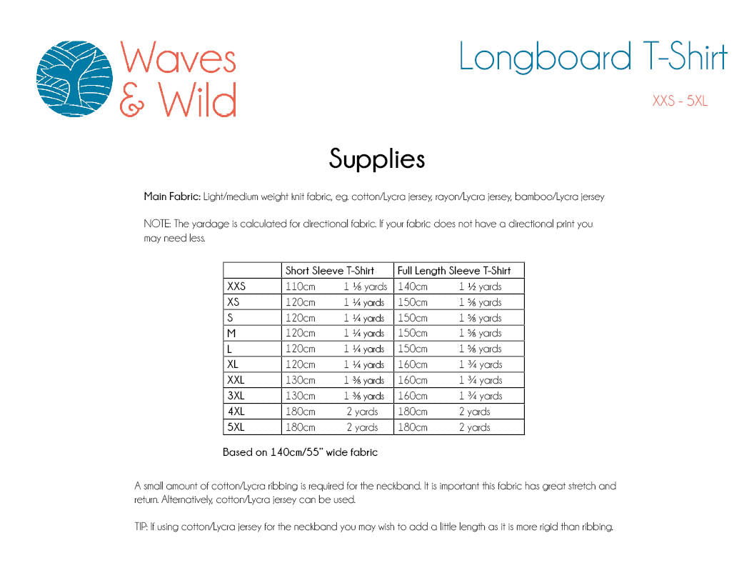 The Longboard T-Shirt pattern goes from XXS – 5XL.