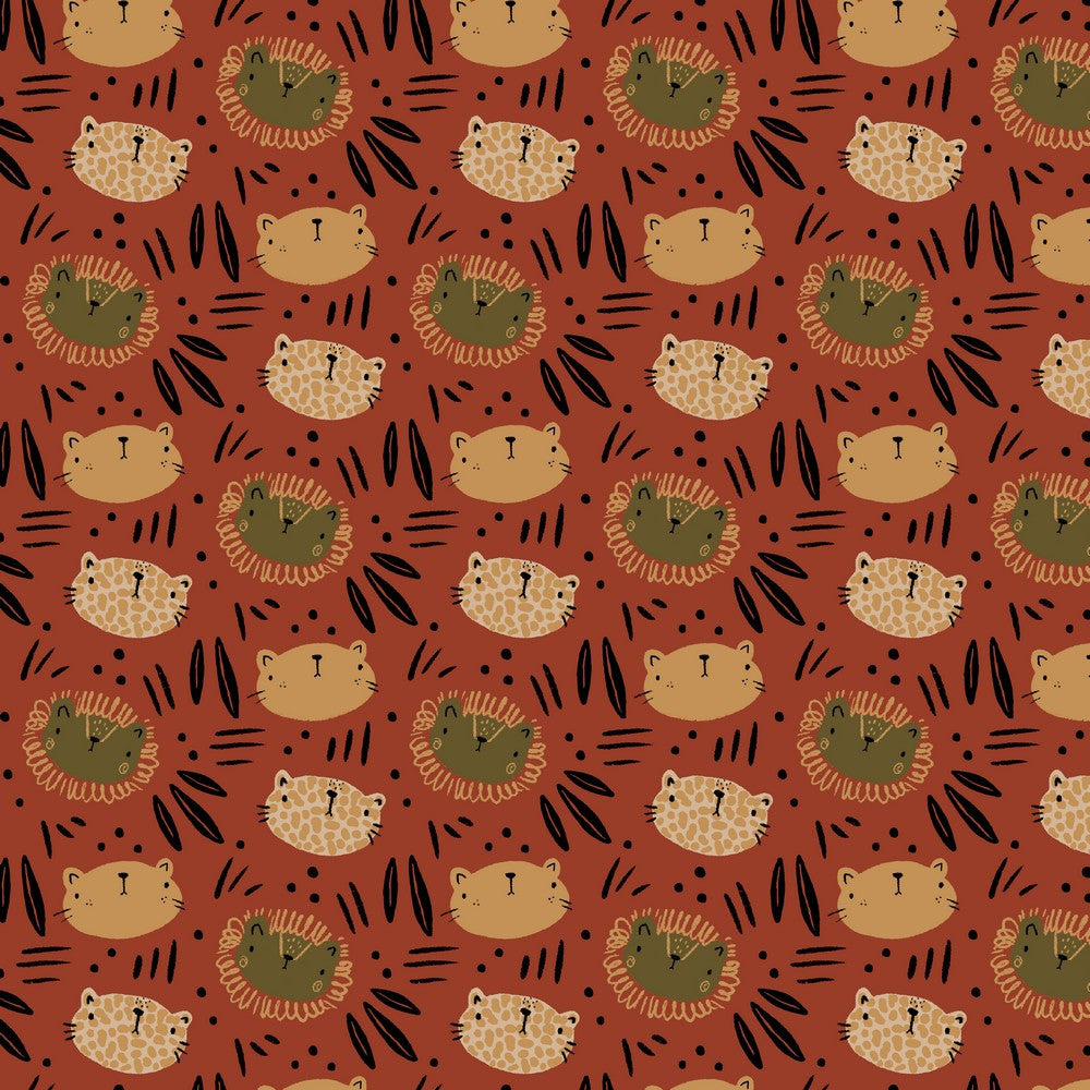 Indulge yourself in some of this gorgeous medium weight jersey, with a sweet animal print... the organic cotton gives it extra green creds and also means its super lovely to work with and wear, This fabric is great for tops, leggings and t-shirts, with 4-way stretch for ultimate comfort. Kids will love the friendly faces of wild cats, including leopards, lions and friendly felines alike, all set on a warm shade of brick red.