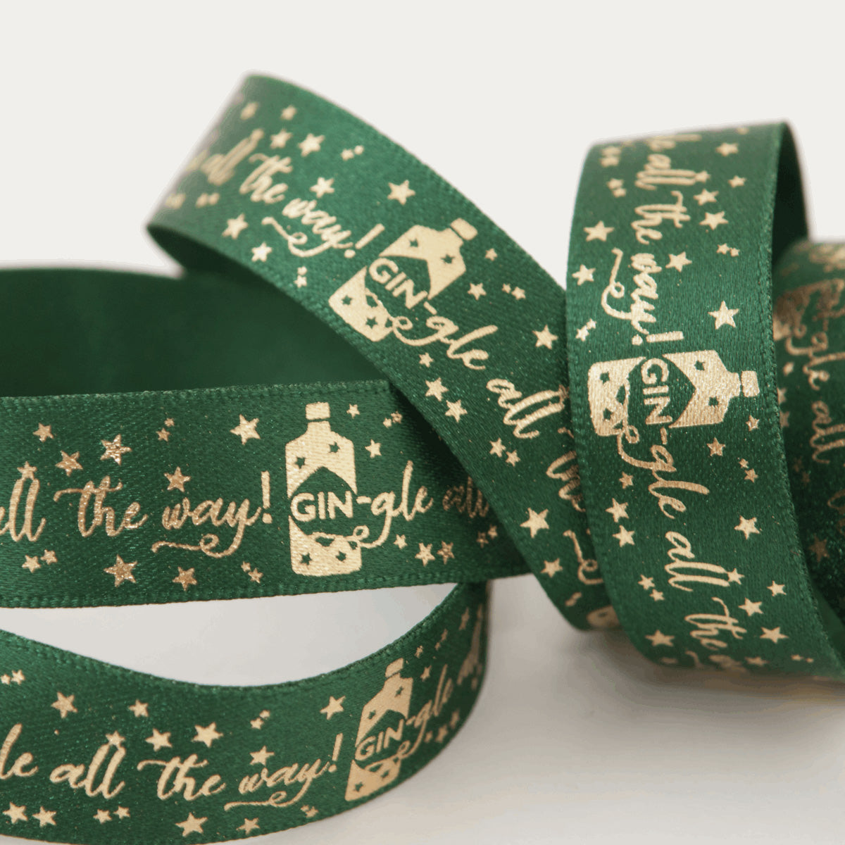 Have a bit of fun with your Christmas crafting this year, with this fun gin inspired ribbon! In a classic festive green shade of gorgeous satin ribbon, it features a punny 'gin-gle' in metallic gold to catch your eye. Great for finishing off gifts!