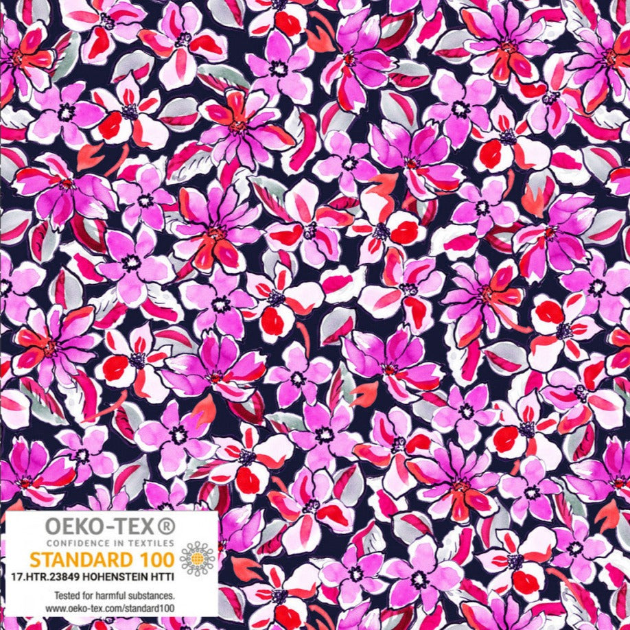 This gorgeous floral print features bold water-colour style floral illustrations in passionate pinks, set on a black background to make them pop! With 4-way stretch for ultimate comfort it's just perfect for dresses, trousers, skirts and tops!