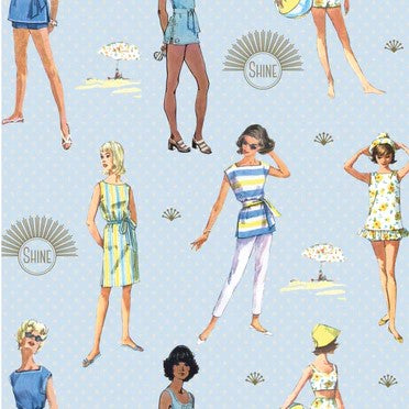 Give your project a vintage touch with this glamorous collection from Simplicity by The Craft Cotton Co. Known for their classic patterns, Simplicity have pulled some of their vintage illustrations from the archives and remixed them into this amazing set of retro prints inspired by a day at the beach. This busy print features a host of ladies in their retro bikinis and swimwear, set on a cute light blue polka dot!