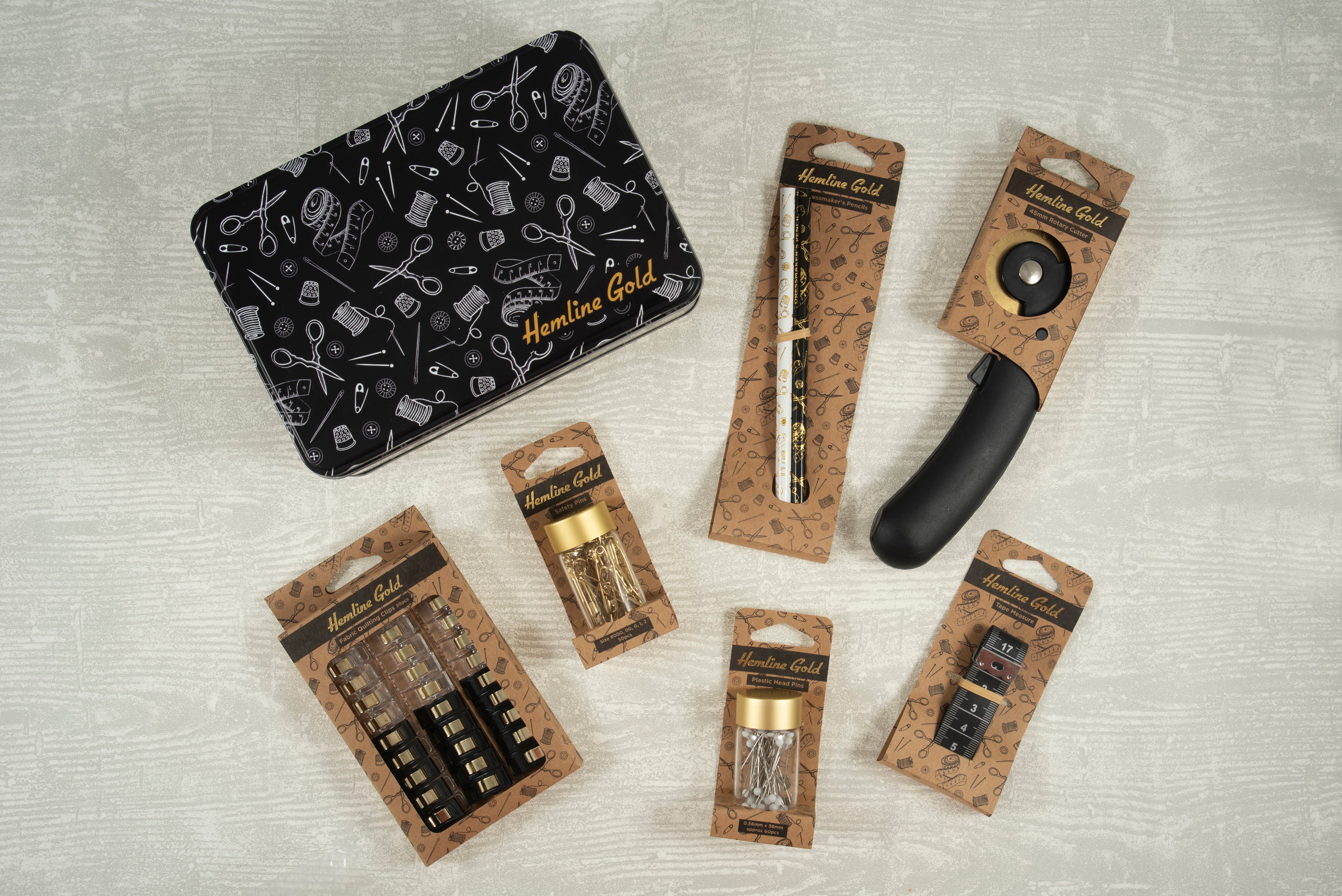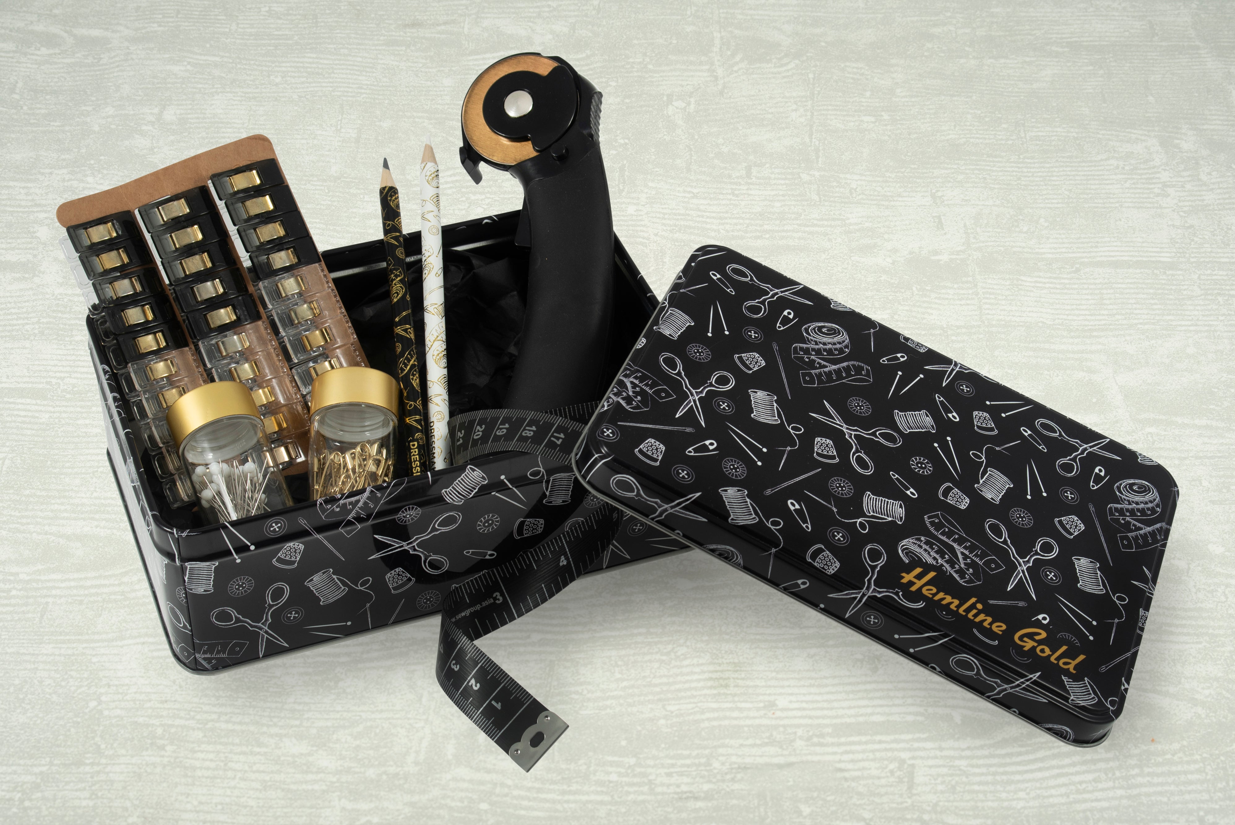 The cute sewing notions tin is filled with a selection of premium Hemline Gold haberdashery, all wrapped up in tissue paper - the perfect gift idea for anyone who loves to sew! Contents include a rotary cutter, fabric clips, dressmaking pencils, retractable tape measure and jars of both pins and needles, covering all the basics for sewing.