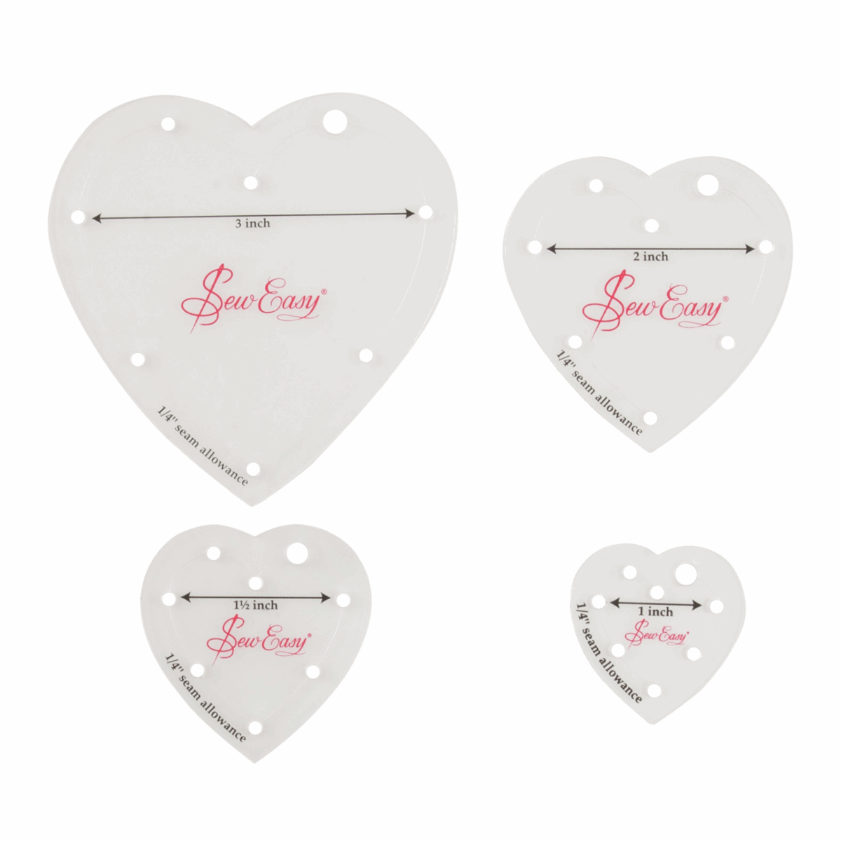 Cut quickly, accurately and professionally with a set of acrylic templates. This set features a range of different size hearts varying from 1" to 3" in size, all with an in-built seam allowance of 1/4" for making life easy. They are completely clear which makes them easy to use, and feature little holes that are ideal for hanging them upon hooks or keyrings, as well as ease of marking your seam allowances.