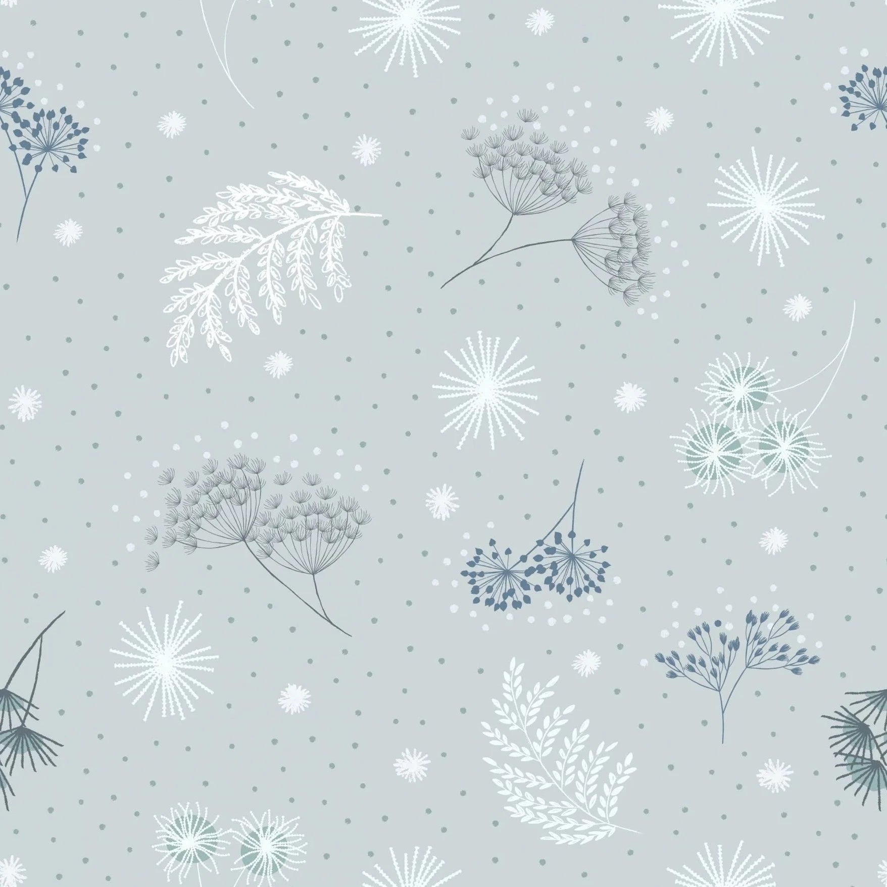 Join us in the secret winter garden with this beautiful collection from Lewis and Irene. Inspired by the garden scenes of winter, it's full of frosty blues and greys, and finished with an amazing pearlised metallic effect for an extra wintry touch! This simple yet sophisticated botanical print features wintry plants blowing in the breeze.