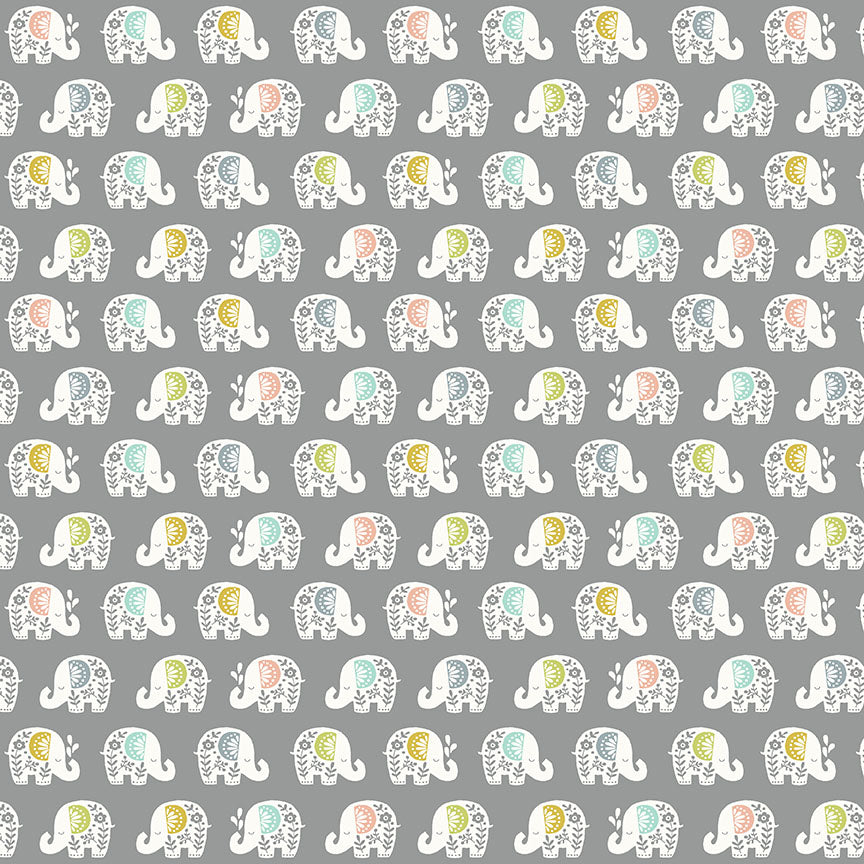 Baby Safari is a new baby-friendly collection from Makower that's perfect for the nursery. In a palette of soft grey, yellow, teal and pink, it's full of friendly safari animals like elephants and giraffes - perfect for all baby projects, from cot quilts to bibs, cushions to playmats. This sweet elephants print features a bunch of little elephants, complemented with beautiful folk-style flaura and fauna on their bodies.