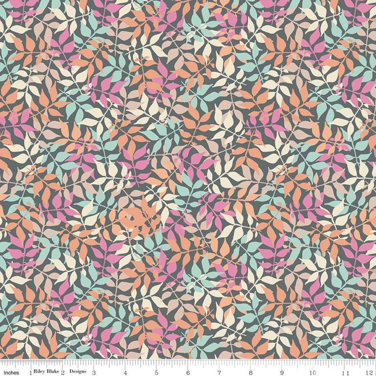 Celebrate those summer shades with this vibrant collection of florals from Riley Blake. Warm shades of pink and orange are contrasted against charcoal grey for a rich contrast in this busy leaf design that's full of summertime vibes. Great for a colourful quilting project, clothing or accessories!