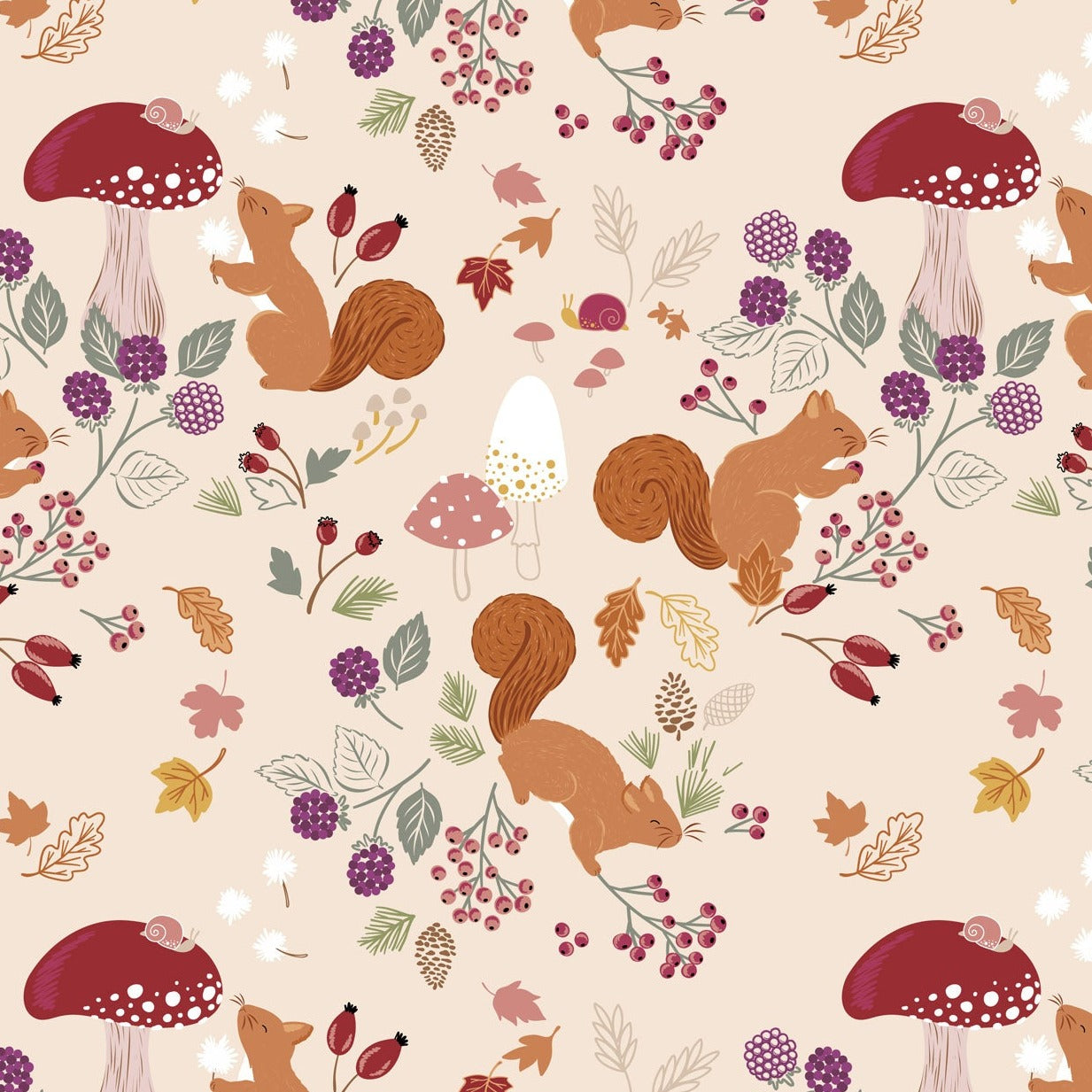 Get cosy with this fun woodland collection from Lewis and Irene. Made in warm shades of cream, berry and taupe, it celebrates the wildlife of autumn and especially the sweet squirrels! This fun print features the squirrels busy at work, foraging for food among the toadstools of the forest.