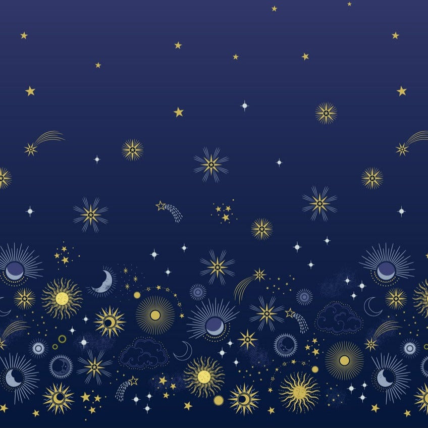 Discover the magic of the universe with this ethereal metallic collection from Lewis and Irene. Set with glittering gold metallic elements that sparkle in the light, this night-sky inspired collection is full of an air of mystery and magic. This eye-catching double border has the design printed on each selvedge, showing the celestial sky in all its glory, for a striking statement that's perfect for featuring on bags, quilts and clothing.