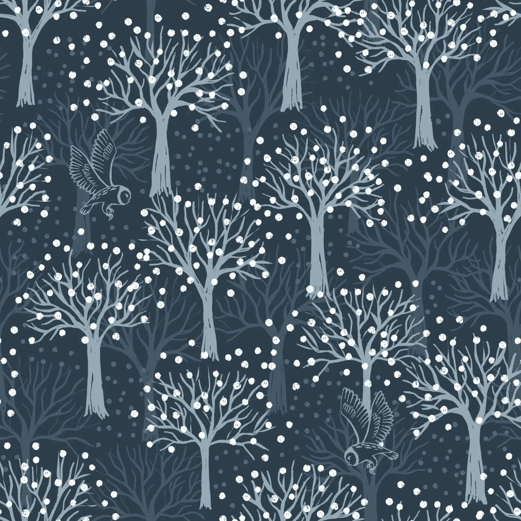 Lewis & Irene The Secret Winter Garden - Owl Orchard Dark Blue (metallic) - 100% Cotton Fabric