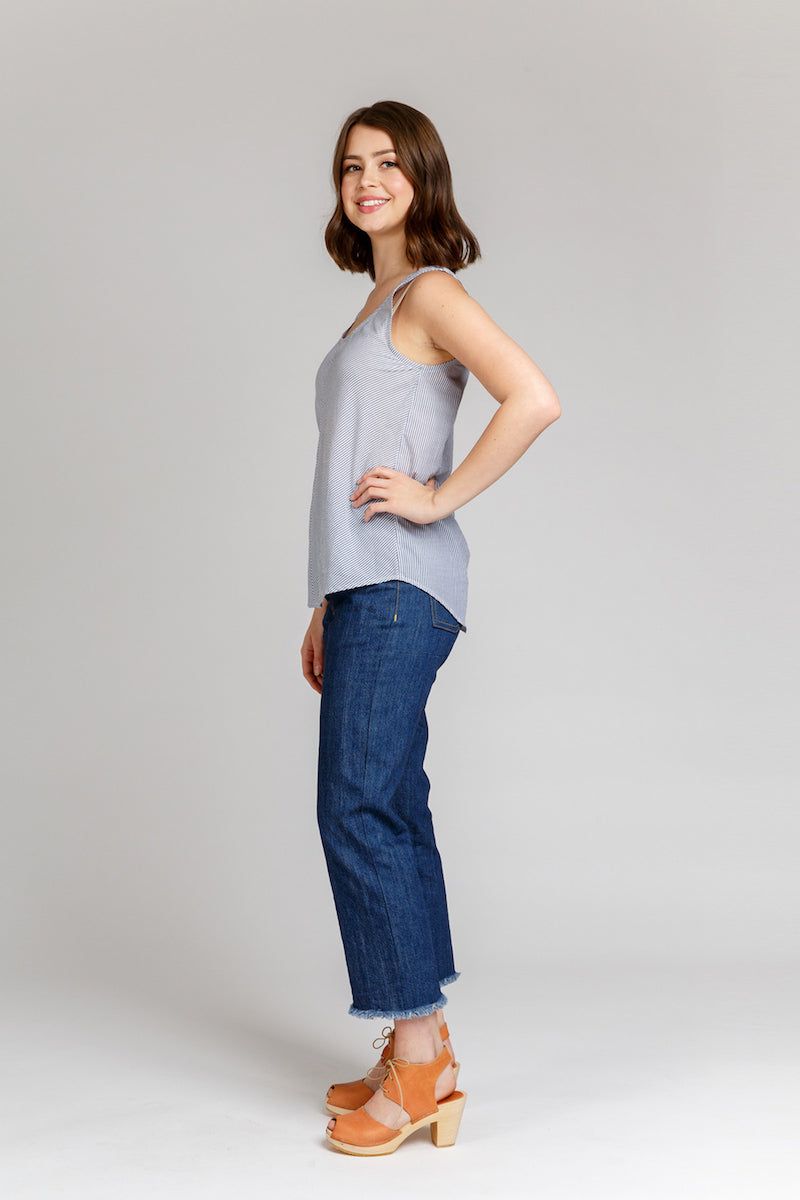 Make a wardrobe-staple tank top or dress with Megan Nielsen. Both versions feature a relaxed fit, scoop neckline, curved hemlines and neat french seams. The top version can either be made as a classic tank or with a centre front seam. The dress version can also be made as one or with a centre front seam for impact/fabric efficiency.