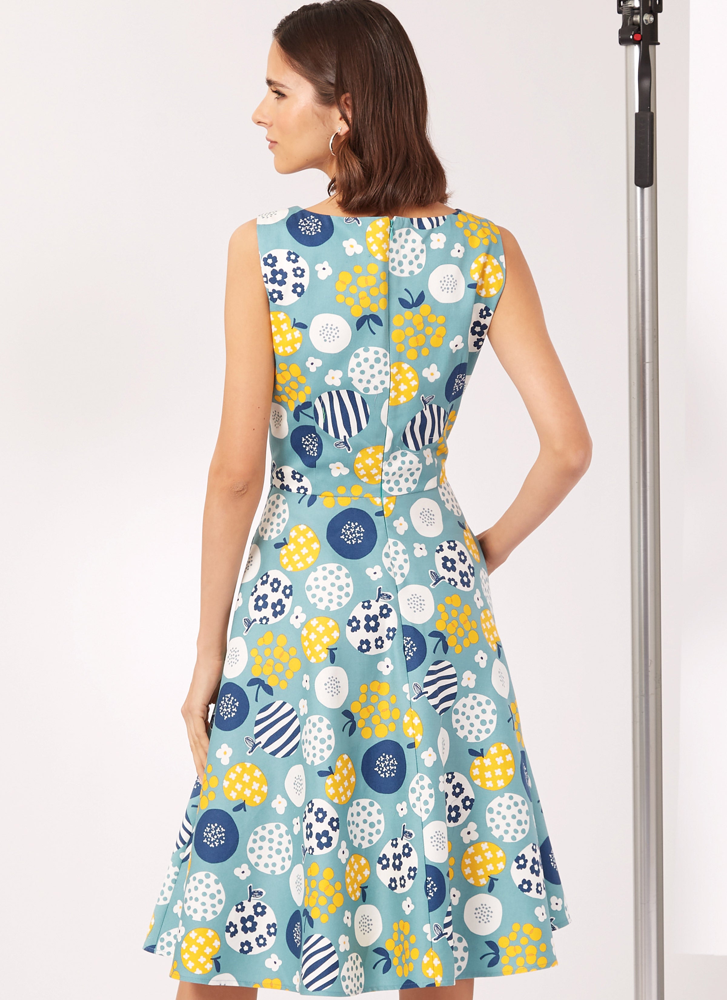 V-neck dress has flared skirt, sleeveless or three-quarter length sleeves, and optional self belt. Dresses have back invisible zipper and back waist darts.