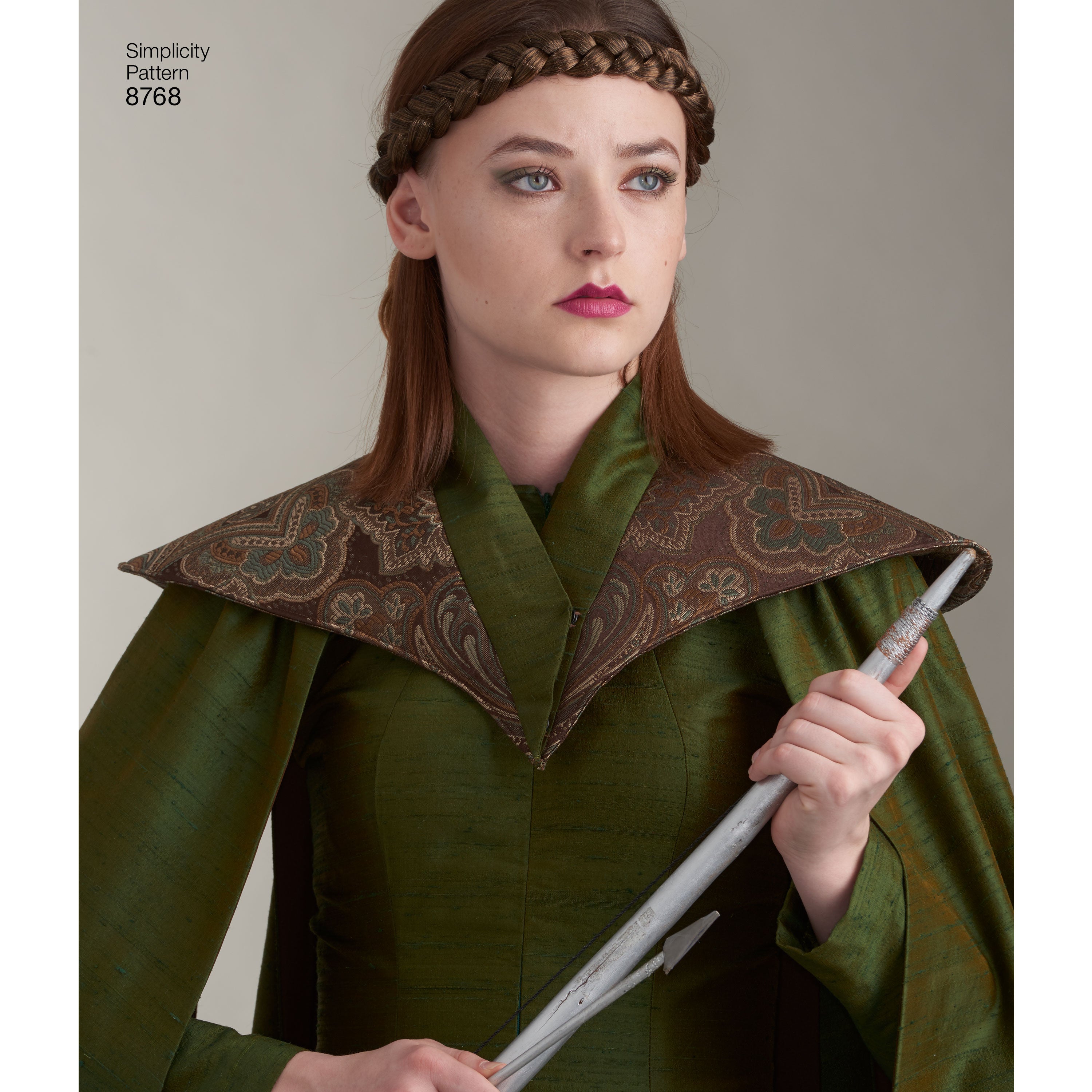 Travel and explore into a whole different world in Simplicity’s womens fantasy coat. Pattern includes two long dresses and two medium length dresses with side slits, a cloak, and shoulder pads with chains.