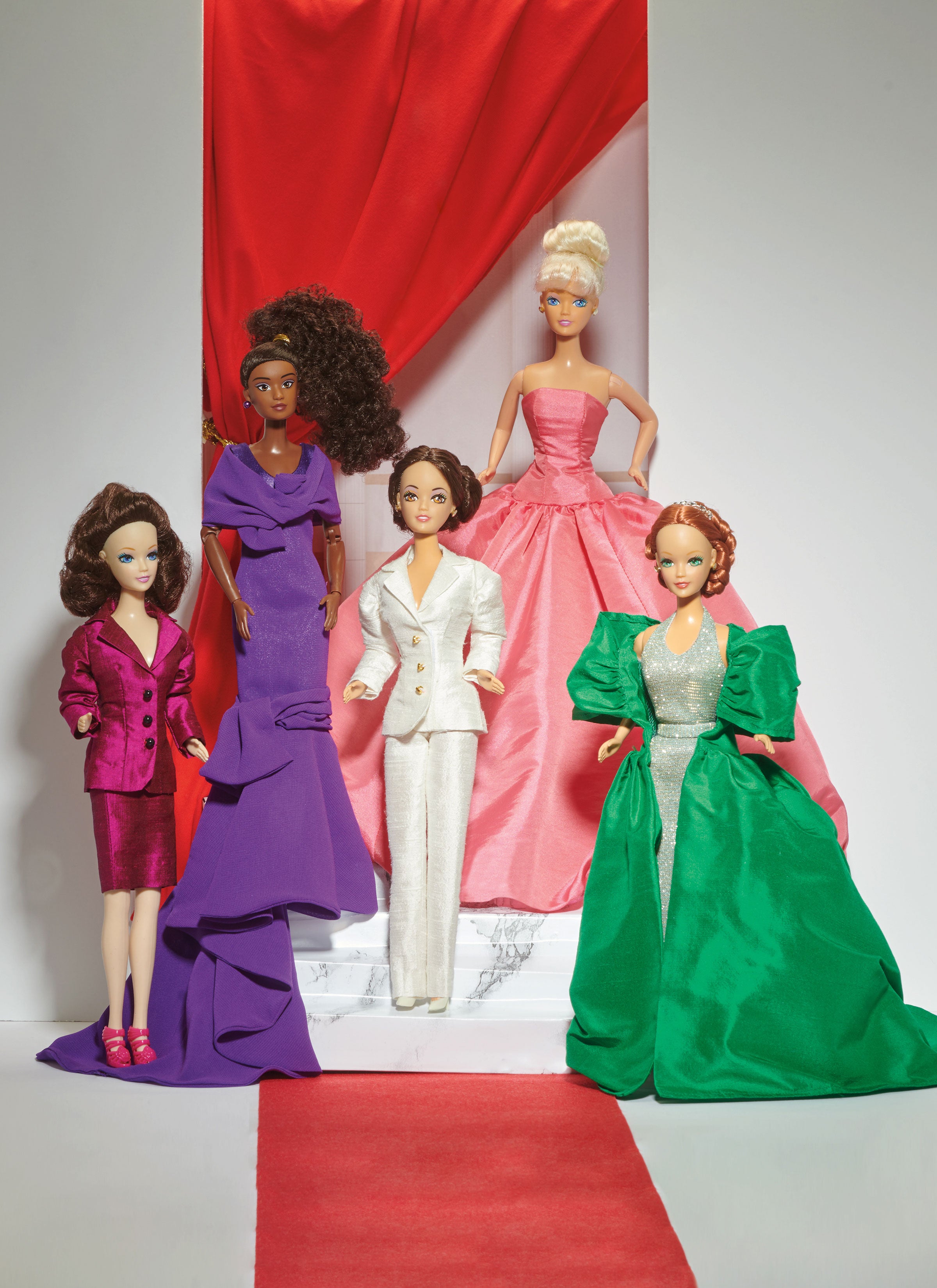 Red carpet-ready fashions for 11-1/2" fashion dolls include tailored skirt or pants suit with notched collar, slim skirt or pants and mini button trim and evening gowns. Slim fit gown with V-neckline and extravagant flared skirt has ruched hem band and matching wrap. Sleeveless gown with dropped waist has bubble hem. Knit halter gown has matching belt and is worn with wrap style coat with shoulder drape, wired waistline and high-low hemmed full skirt. See envelope for more information.