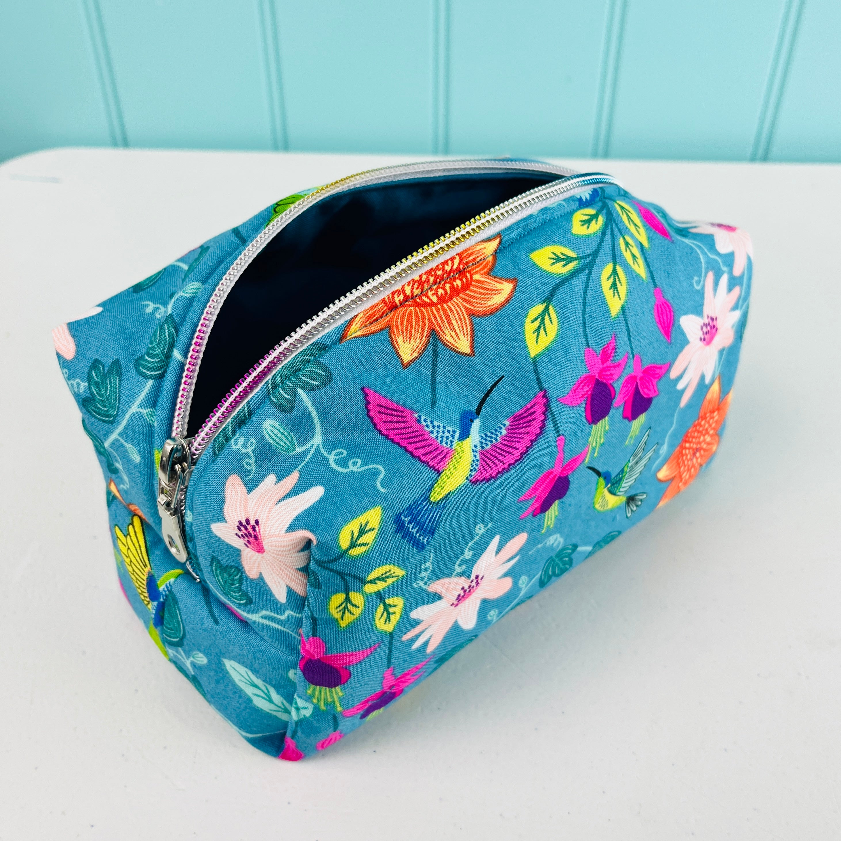 The best part is the vibrant hummingbird themed fabric, offset by the rainbow zip for a pop of colour!