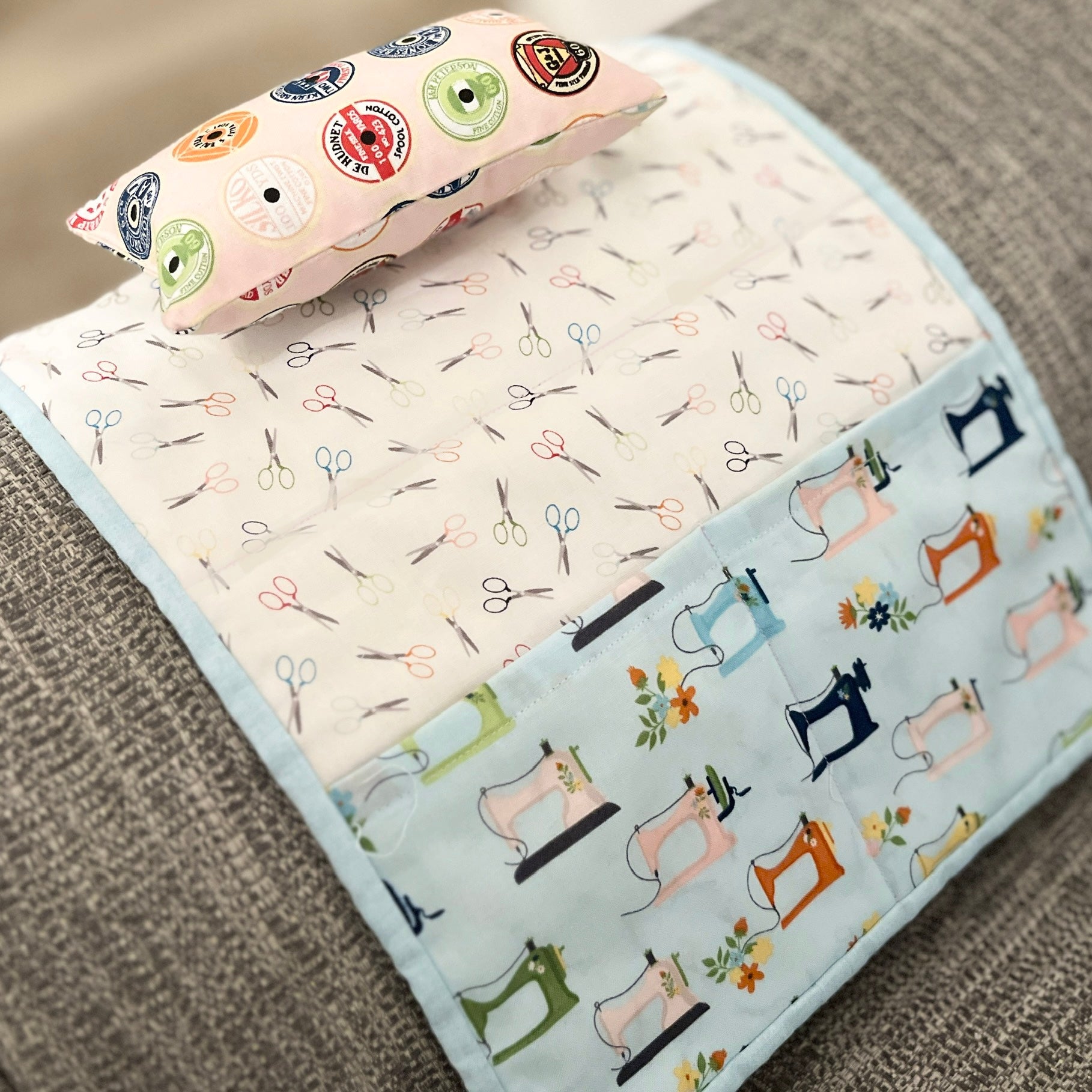 This handy sewing organiser project is perfect for those who love a bit of slow stitching. Designed to sit on the arm of your sofa so you can do some hand sewing in front of the TV, it features a detachable pin cushion in the centre, and pockets on each end to store essentials like scissors and seam rippers. Plus it comes in a cute sewing themed fabric too!